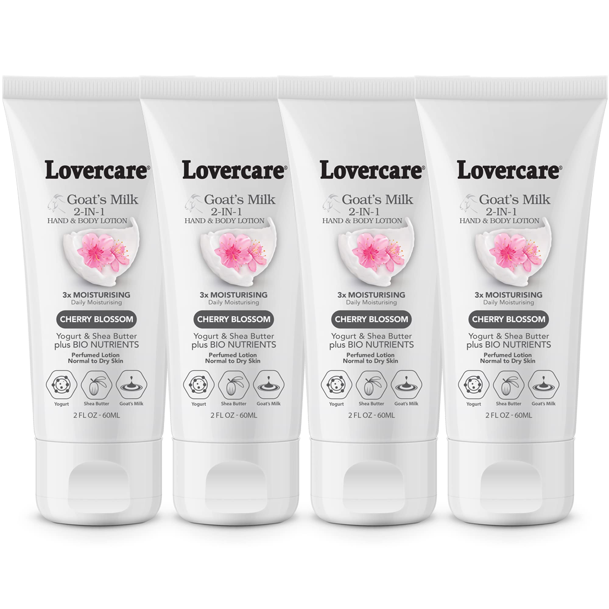 4-PACK Lovercare Goat Milk 2-IN-1 Hand & Body Lotion for Dry Skin 2 oz (60 ml) Cherry Blossom-Pack of 4