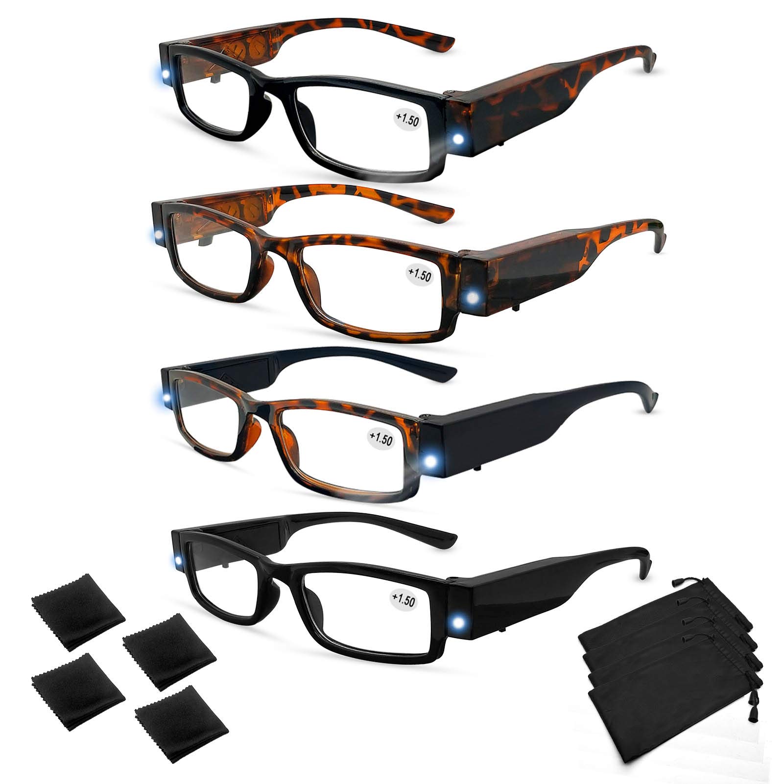 4 Pack Reading Glasses with Lights in the Frame Bright Led Readers Magnifying Glasses with Light for Men Women Led Reading Glasses Lightweight Reading Glasses Eyeglasses+150