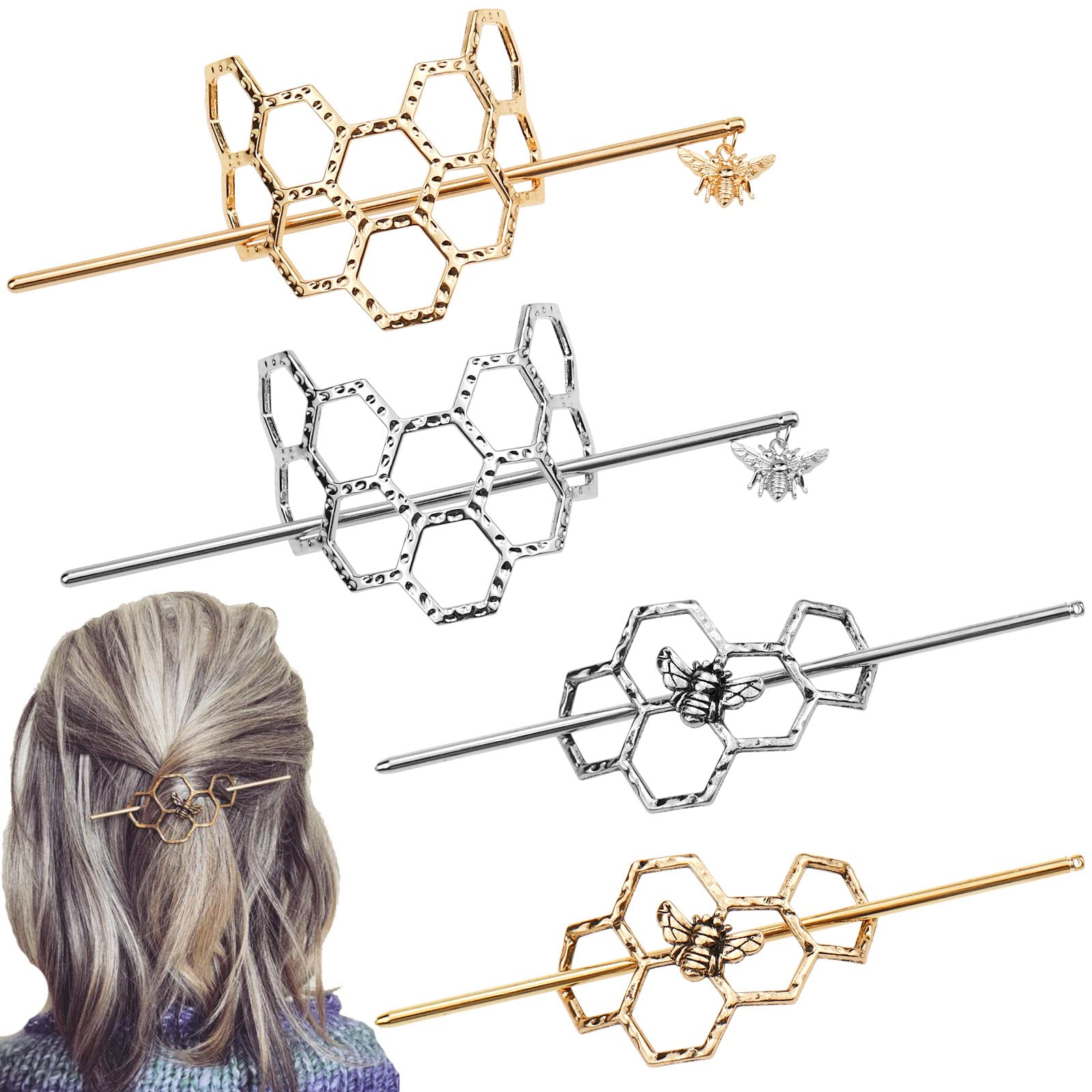 ?Perfect gift?Vintage hairpins make you more charming and elegant, best gift for your family, friends, colleague, or just yourself on Valentine's Day, Mother's Day, Teacher's Day, Christmas, anniversary, or other important days. ?Wide applicable occasions?The bee hair clips can help you easily fix your hairstyle, which is very suitable for parties, dates, weddings, graduations, dances, yoga exercises, travel, vacations, and so on, there are many moments for you to use them. ?Exquisite appearance?The hairpins incorporate the elements of bee and honeycomb, which are eye-catching and charming, the honeycomb style is simple but delicate, makes you more beautiful and attractive, shows your personal taste. ?Material?The hair bun made of durable alloy metal, simple and fashionable, comfortable to use, can serve you for a long time. ?Package include?There are 4 pieces of honeycomb-shaped hair clips, which can meet your various needs of hairstyles.