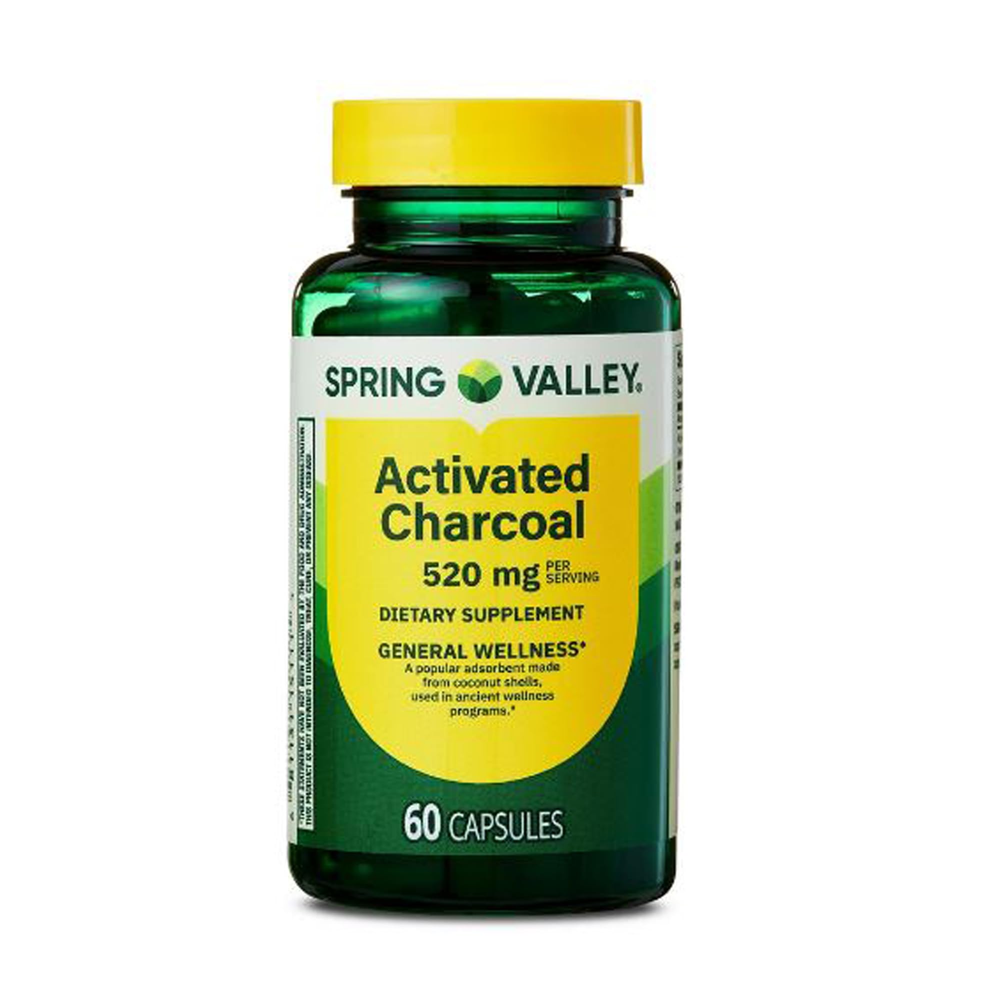 Contains 60 capsules. Tamper-evident bottle. No artificial flavors, colors, sweeteners, or preservatives. No gluten, dairy, soy, or peanuts. 520mg activated charcoal per serving. For general wellness. Dietary supplement. Activated Charcoal Dietary Supplement, 520 mg, 60 count.