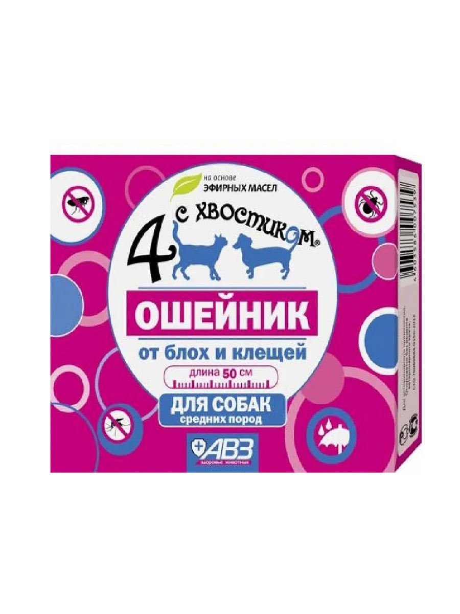 4 с хвостиком, Ошейник репеллентный для собак, 50 см, коричневый. Ошейник репеллентный Четыре с хвостиком применяют собакам для защиты от блох, вшей, власоедов, комаров, иксодовых и чесоточных клещей. После вскрытия упаковки ошейник надевают на животное, подгоняя по размеру так, чтобы между шеей и ошейником оставался промежуток в 1 см, затем пропускают свободный конец ленты через фиксатор, а излишек ленты отрезают, оставляя конец 1,5–2 см. Непрерывное ношение ошейника обеспечивает защиту собак от насекомых до 3 месяцев, клещей — не менее 4 недель. Ошейник Четыре с хвостиком не следует применять щенкам моложе 2-месячного возраста.