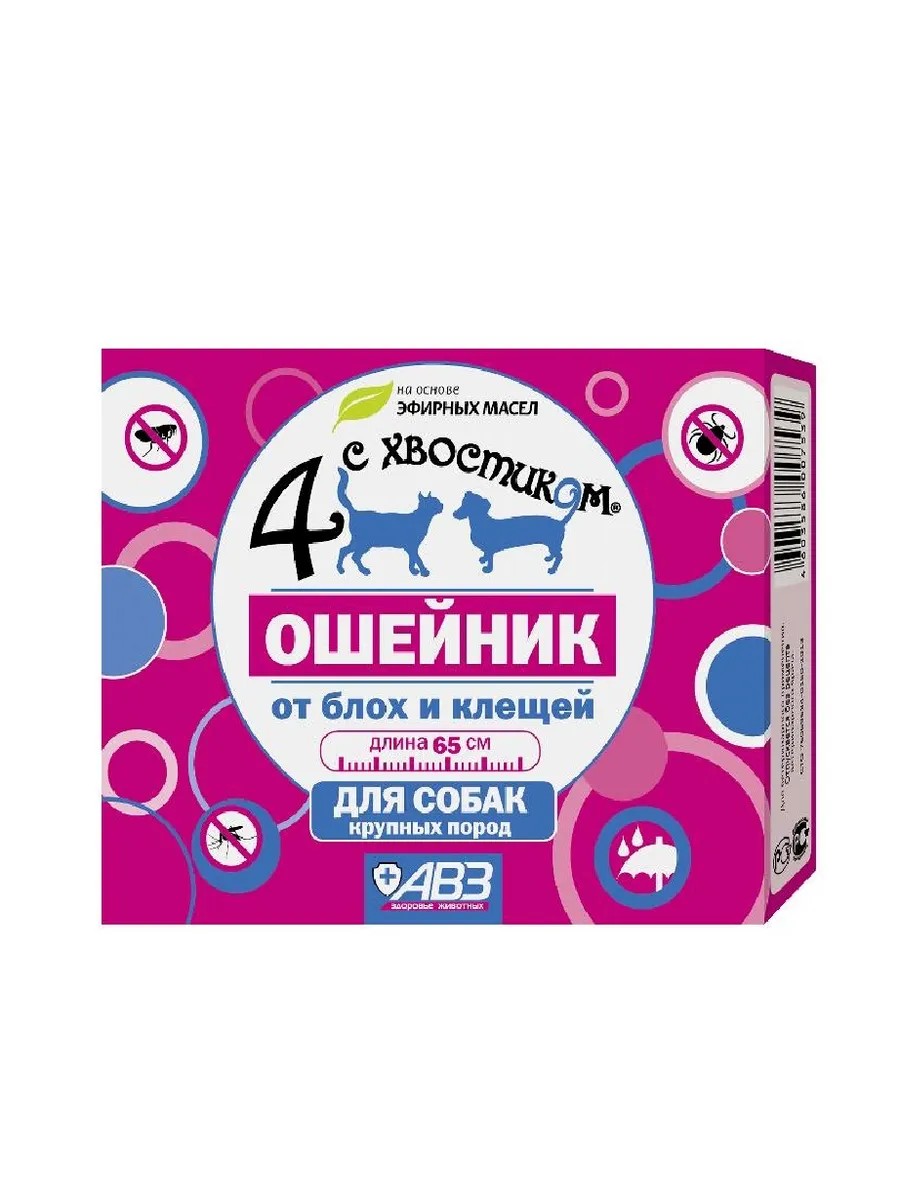 4 с хвостиком, Ошейник репеллентный для собак, 65 см, коричневый. Ошейник репеллентный Четыре с хвостиком применяют собакам для защиты от блох, вшей, власоедов, комаров, иксодовых и чесоточных клещей. После вскрытия упаковки ошейник надевают на животное, подгоняя по размеру так, чтобы между шеей и ошейником оставался промежуток в 1 см, затем пропускают свободный конец ленты через фиксатор, а излишек ленты отрезают, оставляя конец 1,5–2 см. Непрерывное ношение ошейника обеспечивает защиту собак от насекомых до 3 месяцев, клещей — не менее 4 недель. Ошейник Четыре с хвостиком не следует применять щенкам моложе 2-месячного возраста.