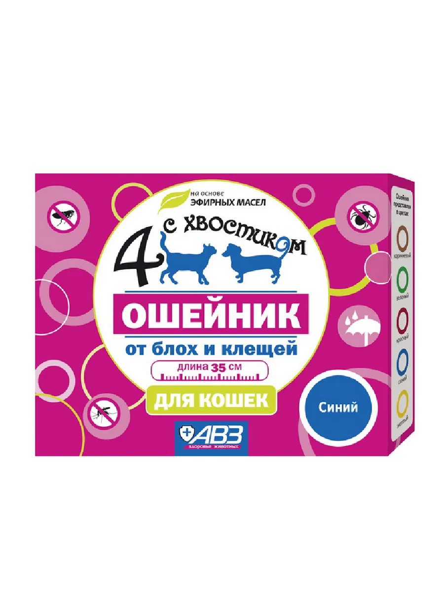 4 с хвостиком, Ошейник репеллентный для кошек, 35 см, синий. Ошейник репеллентный Четыре с хвостиком применяют кошкам для защиты от блох, вшей, власоедов, комаров, иксодовых и чесоточных клещей. После вскрытия упаковки ошейник надевают на животное, подгоняя по размеру так, чтобы между шеей и ошейником оставался промежуток в 1 см, затем пропускают свободный конец ленты через фиксатор, а излишек ленты отрезают, оставляя конец 1,5–2 см. Непрерывное ношение ошейника обеспечивает защиту кошек от насекомых до 3-х месяцев, клещей не менее 4-х недель. Ошейник «Четыре с хвостиком» не следует применять котятам моложе 2-х месячного возраста.