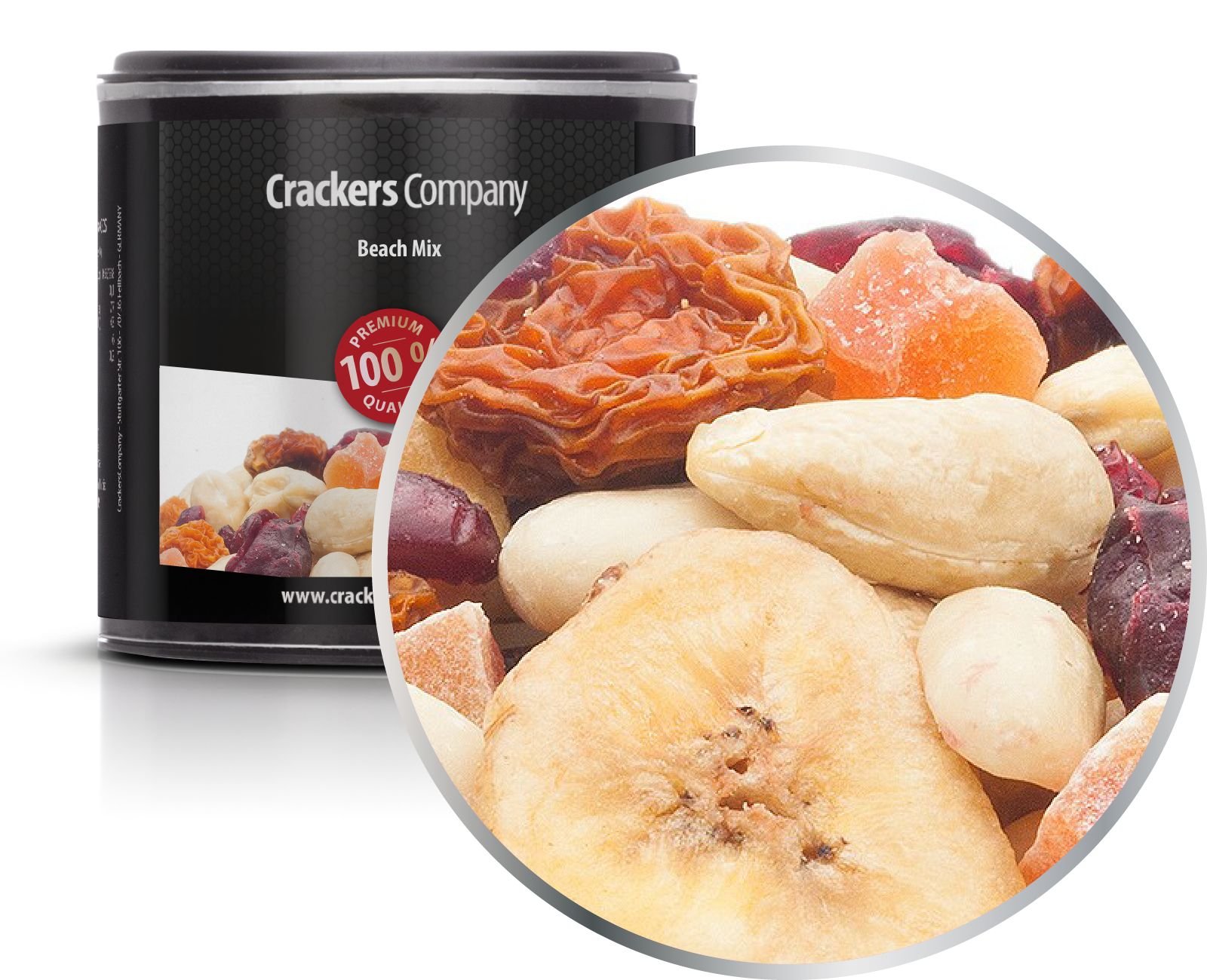 The mix for the perfect day on the beach Summer sun and good mood - nothing stands in the way of a day at the lake or bathing beach.Let your mind wander, admire cloud formations in the sky and the scent of sunscreen on the skin.On days like this, people are in relaxation mode and the summer feeling wins the upper hand.So the soul is taken care of, but something has to be done for the body on a day of sweet lightness.With our Beach Mix you are well looked after with everything that looks really nutritious, filling and energetic to shine with the sun's rays.Mild-creamy cashew nuts, crispy banana slices refined with honey, cranberry, sweet and sour physalis and candied papaya pieces should not be missing as a delicious snack! Summer sun sunshine And right in the middle.The undisputed sun god or the elegant sun goddess relaxes on the bathing rock, the sun glasses on the nose and this relaxed, let, which you can only radiate on a sunny day with a light breeze.In order to make the day perfect, the only thing missing is the perfect beach mix, which does not contaminate and yet supplied with everything to avoid a cravings attack and therefore does not hurt the bikini figure.The popular cashew nuts play boccia with the crispy banana slices that were sweetened with fine honey, the cranberries and wonderful physalis try in beach volleyball and the pretty papaya pieces play Baywatch nixes and just look breathtaking. Let the sun shine in! The feet in the sand, head in the sun.Who doesn't love them, these sun afternoons on the beach or on the bathing lake.Pure relaxation, a cool water that compensates for a sweaty day.On summer days, a balanced diet is particularly important in order not to add too much food to the body.Sitting should be what you treat your body. Ingredients ingredients Cashwkerne, banana, cranberry, captainer berry physalis, honey, papaya, sugar cane, sugar, vegetable oil (hardened), preservative: sulfur dioxide.Can contain traces of sulfites and nuts. Instructions Store cool, dry and protected by light. Address manufacturer importer CrackersCompany, Stuttgarter Straße 106, 70736 Fellbach, Germany More4 x 75g in Membrandose Klein (300g).Der Mix für den perfekten Tag am Strand Sommersonne und gute Laune - einem Tag am See oder Badestrand steht nichts im Wege. Die Seele baumeln lassen, Wolkenformationen am Himmel bewundern und den Duft von Sonnencreme auf der Haut. An Tagen wie diesen ist der Mensch im Entspannungsmodus und das Sommerfeeling gewinnt die Oberhand. Für die Seele ist also gesorgt, aber auch für den Körper muss an einem Tag der süßen Leichtigkeit etwas getan werden. Mit unserem BEACH MIX bist Du bestens mit allem versorgt, was richtig nahrhaft, sättigend und energetisch wirkt, um mit den Sonnenstrahlen um die Wette zu strahlen. Mild-cremige Cashewkerne, knusprige Bananenscheiben mit Honig verfeinert, Cranberry, süß-säuerliche Physalis und kandierte Papayastückchen dürfen da auf keinen Fall als leckerer Snack fehlen! Sommer, Sonne, Sonnenschein Und mittendrin Du. Der unangefochtene Sonnengott oder die elegante Sonnengöttin entspannt auf dem Badelaken, die Sonnebrille auf der Nase und diese entspannt-gelassene Ausstrahlung, die man wohl nur an einem Sonnentag mit leichter Brise ausstrahlt. Um den Tag perfekt zu machen fehlt nur noch der perfekte BEACH MIX, der nicht belastet und dennoch mit allem versorgt, um einer Heißhungerattacke zu entgehen und der Bikinifigur damit nicht schadet. Die beliebten Cashewkerne spielen Boccia mit den knusprigen Bananenscheiben, die mit feinem Honig gesüßt wurden, die Cranberries und herrlichen Physalis versuchen sich im Beachvolleyball und die hübschen Papayastückchen spielen Baywatch-Nixe und sehen einfach atemberaubend aus. Lass die Sonne rein! Die Füße im Sand, den Kopf in der Sonne. Wer liebt sie nicht, diese Sonnennachmittage am Strand oder am Badesee. Entspannung pur, ein kühles Nass, das für einen verschwitzten Tag entschädigt. An Sommertagen ist eine ausgewogene Ernährung besonders wichtig, um den Körper nicht mit zuviel Nahrungsaufnahme zusätzlich zu belasten. Sättigend sollte es sein, was Du Deinem Körper gönnst. INHALTSSTOFFE ZUTATEN CASHEWKERNE, Banane, Cranberry, Kapstachelbeere Physalis, Honig, Papaya, Zuckerrohr, Zucker, Pflanzenöl (gehärtet), Konservierungsstoff: SCHWEFELDIOXID. Kann Spuren von SULFITEN und NÜSSEN enthalten. GEBRAUCHSANWEISUNG Kühl, trocken und lichtgeschützt lagern. ANSCHRIFT HERSTELLER IMPORTEUR CrackersCompany, Stuttgarter Straße 106, 70736 Fellbach, Deutschland Mehr4 x 75g in Membrandose klein (300g).4 x 75g Exotische Studentenfutter Nusskernmischung mit Cashew Banane Cranberry Physalis Papaya Honig ohne salzzusatz vegetarisch glutenfrei laktosefrei 4 x 75g in Membrandose klein (300g)