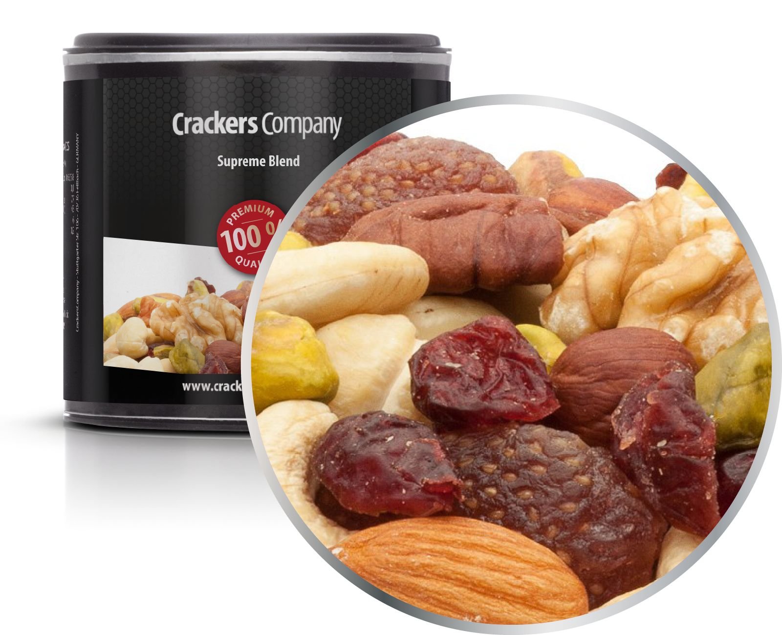 Inspires the palate and the senses You can find the perfect mix of high -quality nuts and delicious fruits in our Supreme Blend, which steals the show every classic student food!In earlier times, the mixture of nut and fruit was considered very expensive and was therefore only reserved for wealthy, i.e. students or pastors.Even at these times it was well known that nuts are a wonderful nerve food, because the valuable unsaturated fatty acids ensure more smooth communication between the nerve cells.One thing is certain that the men's students would have been more than enthusiastic about our interpretation of the student food at the time.The crunchy roasted pistachios, cashew, hazelnut, parannot, walnut, pecanus almonds expand the taste horizon by combining the fruity strawberries and cranberries and not only enlivening the mind! Brain food with fruity surprise monuments Our Surpreme Blend is the perfect power snack for all those who face mentally and physically challenging tasks every day and therefore want to stock up with a healthy and delicious energy supplier.Packed with vitamin B1, our roasted pistachios, cashew, hazelnut, paranners, walnut, pecanus almonds skillfully increase the energy generation of the gray cells, which, in conjunction with our two surprisingly delicious strawberries and cranberries, increase the ability to concentrate and learn.The high content of healthy vital fabrics makes our Surpreme Blend a delicious-fruity mix that gives you the right portion of power at the right time and also tastes really awesome. Ingredients ingredients Pistachio nuclei, cashew nut, strawberry, sugar, cranberry, sugar cane, hazelnut kernels, almond kernels, paranners, walnut kernels, pecanny, sunflower oil, acid regulator: citric acid, aroma, dye, preservative: sulfur dioxide.Can contain traces of gluten, sesame, soy, peanut nuclei, nuts, milk and dairy products. Instructions Store cool, dry and protected by light. Address manufacturer importer CrackersCompany, Stuttgarter Straße 106, 70736 Fellbach, Germany More4 x 80g in membrandosis small (320g).Beflügelt den Gaumen und die Sinne Die perfekte Mischung hochwertiger Nüsse und köstlicher Früchte findest Du in unserem SUPREME BLEND, der jedem klassischen Studentenfutter die Show stielt! In früheren Zeiten galt die Mischung aus Nuss und Frucht als sehr teuer und war deshalb nur den Wohlhabenden vorbehalten, also Studenten oder Pfarrern. Schon zu diesen Zeiten war wohl bekannt, dass Nüsse eine wunderbare Nervennahrung sind, denn die wertvollen ungesättigten Fettsäuren sorgen für eine reibungslosere Kommunikation zwischen den Nervenzellen. Eines ist sicher, über unsere Interpretation des damaligen Studentenfutters wären die Herren Studenten sicherlich mehr als begeistert gewesen. Die knackig gerösteten Pistazien, Cashew, Haselnuss, Paranuss, Walnuss, Pecanuss Mandeln erweitern durch ihrer Kombination mit den fruchtigen Erdbeeren und Cranberries ganz eindeutig den Geschmackshorizont und beleben dadurch nicht nur den Geist! Brainfood mit fruchtigen Überraschungsmomenen Unser SURPREME BLEND ist der perfekte Powersnack für alle die, die sich tagtäglich geistig- und körperlich herausfordernden Aufgaben stellen und sich daher mit einem mit gesunden und köstlichen Energielieferanten eindecken möchten. Vollgepackt mit Vitamin B1 steigern unsere gerösteten Pistazien, Cashew, Haselnuss, Paranuss, Walnuss, Pecanuss Mandeln gekonnt die Energiegewinnung der grauen Zellen, die in Verbindung mit unseren beiden überraschend leckeren Erdbeeren und Cranberries die Konzentrations- und Lernfähigkeit steigern. Der hohe Gehalt an gesunden Vitalstoffen macht unseren SURPREME BLEND zu einem köstlich-fruchtigen Mix, der Dir zur richtigen Zeit, die richtige Portion Power verleiht und obendrein auch noch richtig genial schmeckt. INHALTSSTOFFE ZUTATEN PISTAZIENKERNE, CASHEWKERNE, Erdbeere, Zucker, Cranberry, Zuckerrohr, HASELNUSSKERNE, MANDELKERNE, PARANUSS, WALNUSSKERNE, PEKANNUSS, Sonnenblumenöl, Säureregulator: Zitronensäure, Aroma, Farbstoff: Karmin, Konservierungsstoff: SCHWEFELDIOXID. Kann Spuren von GLUTEN, SESAM, SOJA, ERDNUSSKERNE, NÜSSEN, MILCH und MILCHPRODUKTEN enthalten. GEBRAUCHSANWEISUNG Kühl, trocken und lichtgeschützt lagern. ANSCHRIFT HERSTELLER IMPORTEUR CrackersCompany, Stuttgarter Straße 106, 70736 Fellbach, Deutschland Mehr4 x 80g in Membrandose klein (320g).4 x 80g Studentenfutter Supreme Superfood mit Pistazie Cashew Erdbeere Cranberry Haselnuss Mandel Paranuss Walnuss Pekannuss ohne salzzusatz 4 x 80g in Membrandose klein (320g)