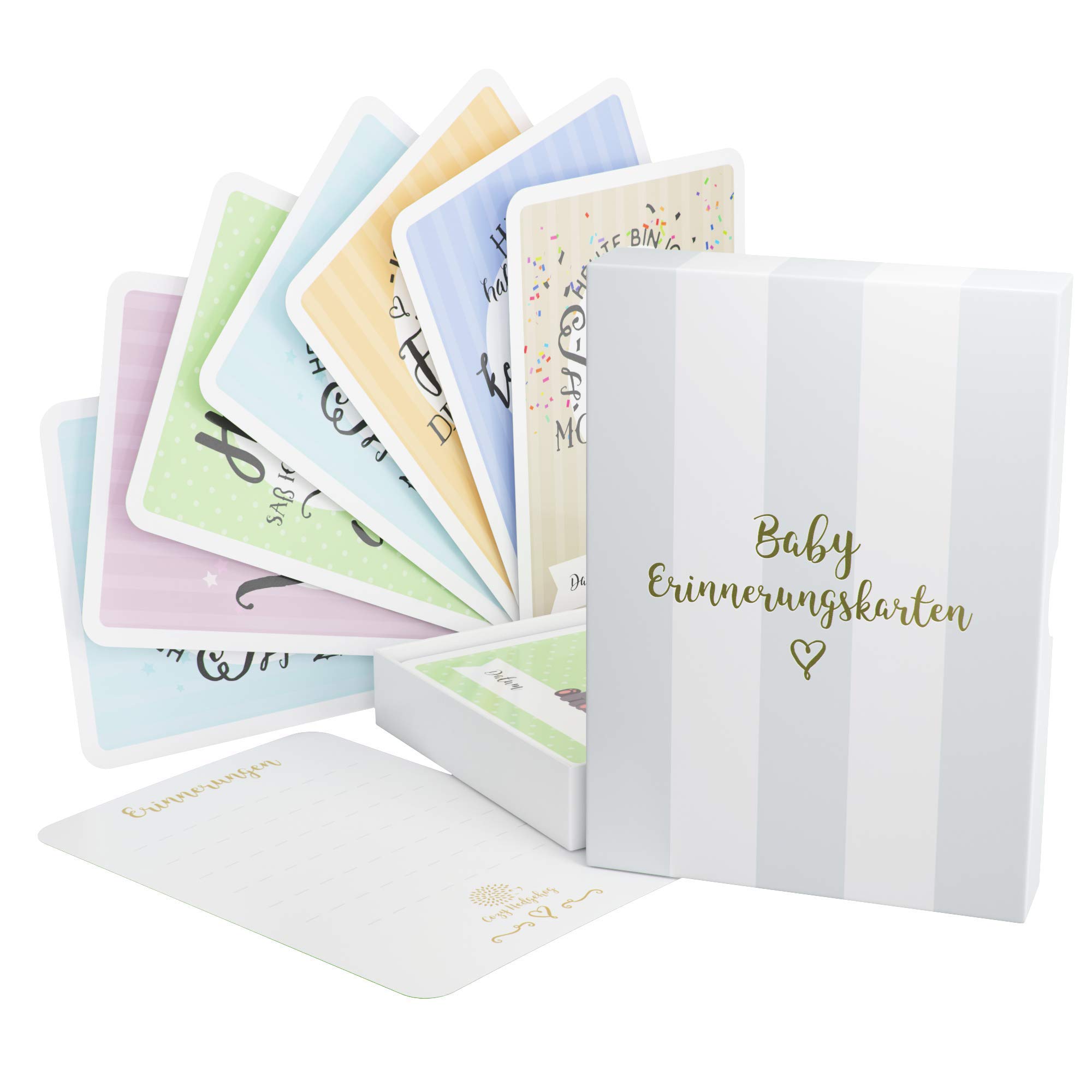 Cards included: 34 Age development success, including baby cards for birth, 3 blank cards for personal design and entering your own favorite moments and 3 pregnancy cards.One of the best gift ideas for expectant mothers.See for information on the individual cards!.A perfect gift set for the Baby Shower of a friend or a dear person.All cards are provided with sensitive texts, suitable for families with two parents and for single parents.They are written in German.Photo album and photo box as the ideal gifts for the baby shower or as a welcome decoration for your baby.Each baby card measures approx. 15 cm x 10.5 cm (A6).The perfect size to keep it next to a baby!The designs are printed professionally on a fixed, durable cardboard and each card is matted.So it becomes the perfect writing material with glare protection for flash lighting.Baby card milestones 1-12 months.The back of each card offers space for writing, the front is a field for entering the date.In this way you can capture the child's first special development steps in detail in the photo book.40 unique, child -friendly baby milestone cards, modern, gender -neutral (unisex) illustrated in pastel shades and presented in a beautiful storage box.Take a picture of your little darling, how he smiles, laughs, runs and speaks for the first time, and share it with your friends on social media or photo album.KARTEN ENTHALTEN: 34 Alters- Entwicklungserfolge, darunter Babykarten zur Geburt, 3 Blanko-Karten zur persönlichen Gestaltung und zum Eintragen der eigenen Lieblingsmomente sowie 3 SCHWANGERSCHAFTSKARTEN. Eine der besten Geschenkideen für werdende Mütter. Siehe für Informationen zu den einzelnen Karten!. Ein perfektes Geschenkset für die BABY SHOWER einer Freundin oder eines lieben Menschen. Alle Karten sind mit einfühlsamen Texten versehen, geeignet sowohl für Familien mit zwei Elternteilen als auch für Alleinerziehende. Sie sind in deutscher Sprache verfasst. Fotoalbum und Fotobox als die idealen Geschenke zur Babyparty oder als Willkommensdeko für Ihr Baby. Jede Babykarte misst ca. 15 cm x 10,5 cm (A6). Die perfekte Größe, um sie neben ein Baby zu halten! Die Designs werden professionell auf festem, haltbarem Karton gedruckt und jede Karte ist matt laminiert. So wird sie zum perfekten Schreibmaterial mit Blendschutz bei Blitzlichtaufnahmen. Baby Karten Meilensteine 1-12 Monate. Die Rückseite jeder Karte bietet Platz zum Schreiben, die Vorderseite ein Feld zum Eintragen des Datums. So kann man die ersten besonderen Entwicklungsschritte des Kindes detailliert im Fotobuch festhalten. 40 einzigartige, kindgerechte BABY MILESTONE CARDS, modern, GESCHLECHTSNEUTRAL (UNISEX) illustriert in Pastelltönen und in einer schönen Aufbewahrungsbox präsentiert. Machen Sie ein Bild von Ihrem kleinen Liebling, wie er lächelt, lacht, läuft und zum ersten Mal spricht, und teilen Sie es mit Ihren Freunden in den sozialen Medien oder Ihrem Fotoalbum.40 Meilensteinkarten Baby für Jungen Mädchen Geschenkbox Baby Shower Geschenk Taufe Geburt Schwangerschaft