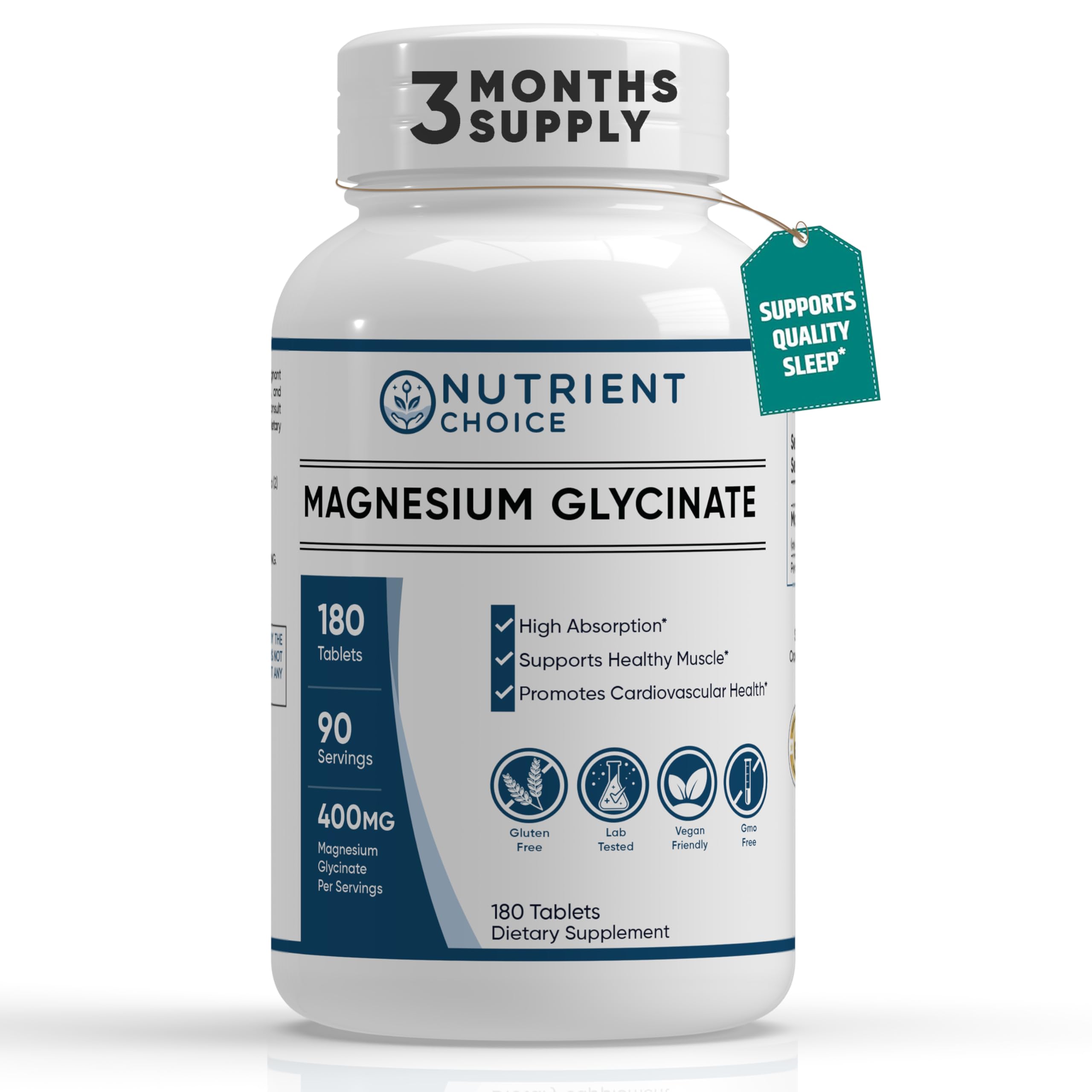 CAUTION:- Do not exceed the recommended dose. This product is not intended for use by pregnant or nursing women, children under 18 years of age, or individuals with a known medical condition without the advice of a qualified healthcare professional. Always consult your physician or healthcare provider prior to use if you are taking medication or have any medical concerns. VEGAN FRIENDLY, GLUTEN-FREE:- Formulated without GMOs, gluten, dairy, soy, or artificial preservatives—suitable for most dietary needs and preferences. LAB TESTED FOR QUALITY PURITY: Each batch is independently tested for safety, potency, and quality, ensuring you receive a product you can trust. PROUDLY MADE IN THE USA:- Our Magnesium Glycinate is manufactured in the United States using premium-quality ingredients. Produced in a GMP-certified facility, each batch is crafted under strict quality control standards to ensure purity, potency, and consistency you can trust. SUGGESTED USE:- Take two (2) tablets daily with a meal, or as directed by your healthcare provider. For best results, take consistently at the same time each day to support optimal absorption and effectiveness. OPTIMAL DAILY DOSAGE – 400MG MAGNESIUM GLYCINATE PER SERVING:- Each bottle contains 180 easy-to-swallow tablets, with a recommended serving size of 2 tablets per day. Every 2-tablet serving delivers 400mg of elemental magnesium as fully magnesium glycinate, known for its superior absorption and gentle support. With 90 servings per container, you get a full 3-month supply for consistent daily use. NON-GMO, CLEAN LABEL FORMULA:- Each capsule contains only pure magnesium glycinate, free from GMOs, gluten, soy, dairy, and artificial additives. We've intentionally excluded unnecessary fillers, binders, and synthetic ingredients to ensure you're getting a clean, high-quality that supports your health without compromise. PURE SUPPLEMENTATION: Crafted for quality and purity, our Nutritional Choice Magnesium Glycinate Capsules deliver 100 pure magnesium glycinate—free from fillers, binders, or artificial additives. Designed for superior absorption and gentle digestion, this highly bioavailable form of magnesium supports overall wellness, muscle relaxation, restful sleep, and healthy nerve function.