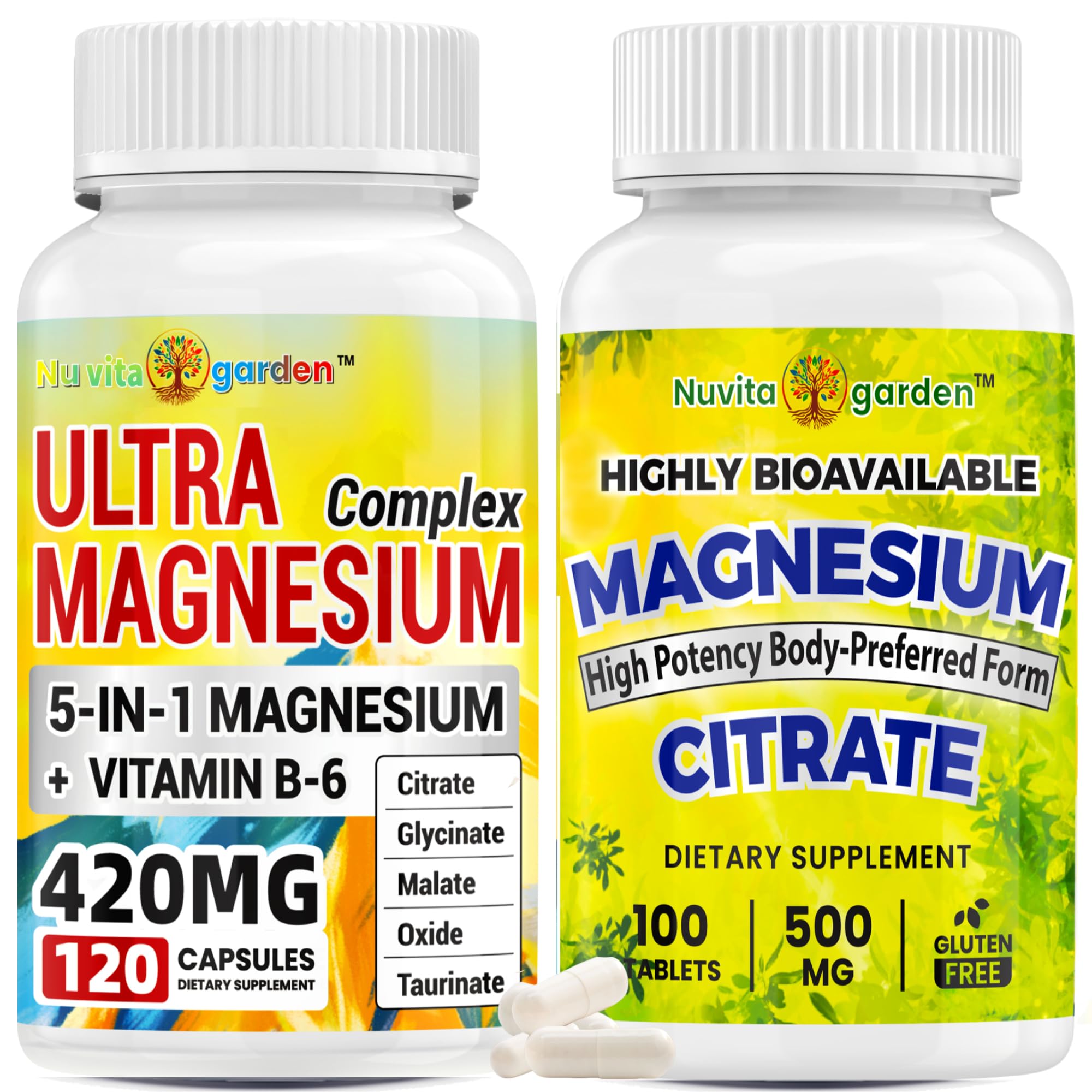 Five Chelated Forms Magnesium Glycinate, Citrate, Taurate, Oxide Malate Vitamin B6: magnesium complex comes in five excellent forms of magnesium, all of which are designed to optimize absorption and bioavailability. This gluten free magnesium supplement contains no synthetic dyes and no artificial flavors. 3rd party tested.Made in USA. These high absorption magnesium complex supplement help relax the body. Adults take two of these magnesium supplement daily with water and a meal. This magnesium supplement for women and men supports sleep better, muscle relaxation, nerve health, heart health, and bone health with magnesium. Nerve, bone and heart support supplement: contains one 120 capsules bottle of 5-in-1 420mg magnesium complex 30mg vitamin b6 supplement and one 100 tablets bottle of magnesium citrate 500 mg per serving for 110-day supply.