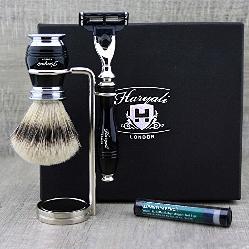 CUSTOMER SATISFACTION: HARYALI LONDON will give 100% free replacement or full money back refund if customer is not satisfied with the purchase. Shaving stand will keep your brush and razor safe and also expand the life of brush by allowing it to properly dry the badger hairs on the brush. Alum pencil is a crystal-like stone that is gently rubbed over the shaved area to combat with razor burn, razor bumps and redness. Shaving brush is made up of silver tip badger hairs and you cannot do a perfect and clean shave without a shaving brush. Some people use their hands to make lather but hands cannot reach there were the bristles on the brush can reach. The handle of our 3 edge safety razor is made up of high quality aluminum with black powder coating on it which makes it more durable. Our mens razor is suitable for peoples with thick, coarse or even curly hair. It works straight on ingrown hair, beard, and mustache and gives a smooth shave. Our mens manual shaving set comes with 3 edge razor, shaving brush, shaving stand, and alum pencil. Comes in a beautiful black box and can be a perfect gift set for your son, father, husband and friends on birthday, thanksgiving or Christmas.