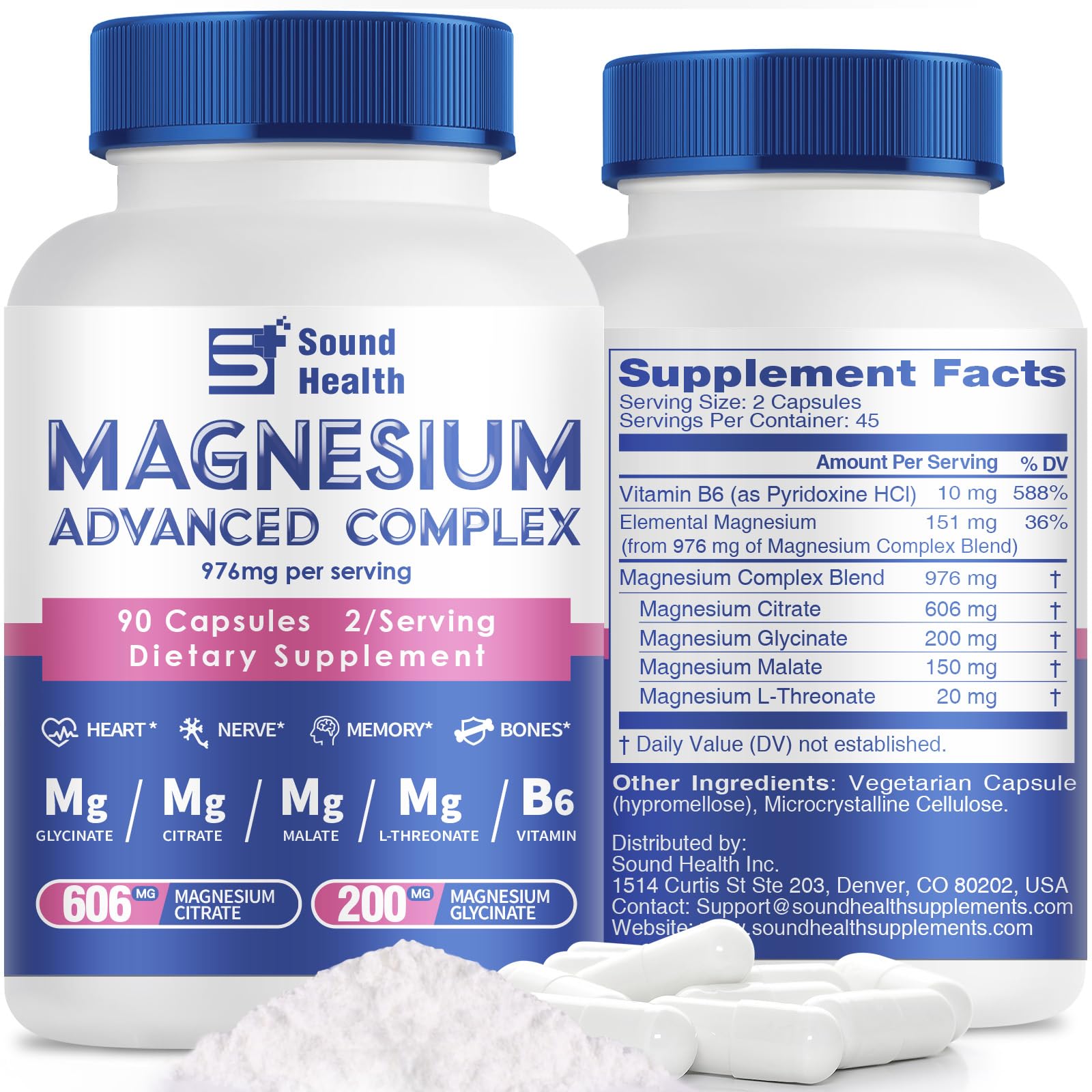5 in 1 Magnesium Complex Capsule 976mg wtih Magnesium Glycinate Citrate Malate L-Threonate & Vitamin B6 High Absorption Magnesium Complex for Women & Men Third-Party Tested Vegan Non-GMO Unflavored 90 Count (Pack of 1)