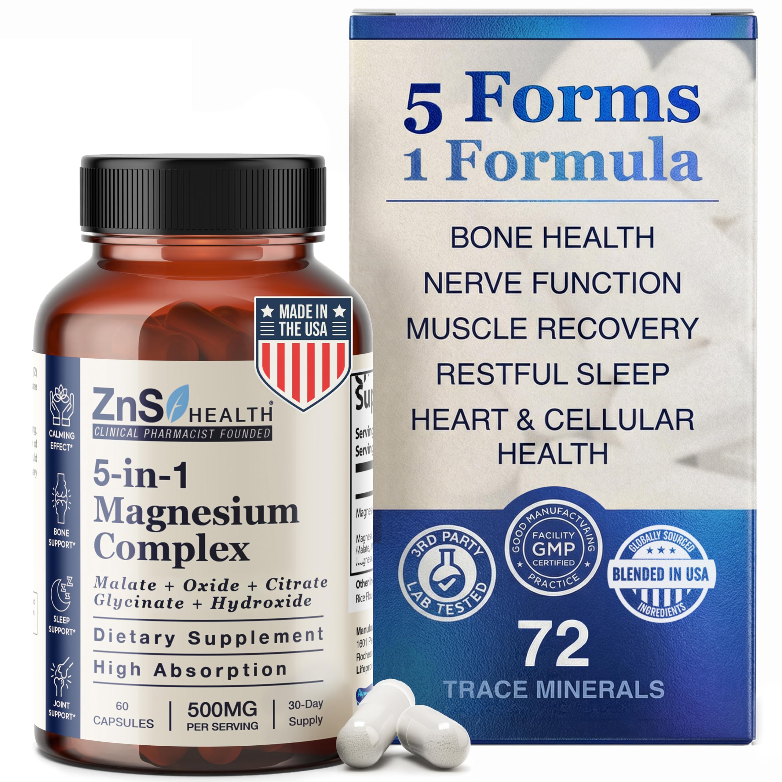 Clinical Pharmacist-Founded Company: We know what research-backed ingredients work! Our sole focus is on your safety. Our Magnesium Complex product is blended and manufactured in a US-based fully compliant, NSF-certified, cGMP facility, not a questionable overseas one. We care about what you put into your body!. High Quality, Healthy Ingredients: 5-in-1 Magnesium Complex is made using the best high-quality ingredients. It is Vegan friendly, Non-GMO, Soy-Free, Yeast-Free, Gluten-Free, and Magnesium Stearate-Free. All products are third-party tested for purity, accuracy, microbes, and heavy metals. Supports Muscle Recovery, Bone Health, Energy, Relaxation, and Neuromuscular Function: Highly bioavailable and chelated Magnesium Malate, Magnesium Glycinate, and Magnesium Citrate help to reduce muscle pain and discomfort, support energy, rest and relaxation, heart health, and is a great addition to your active lifestyle. Made with Aquamin Marine Magnesium: Our Magnesium Complex supplement stands out from all others because it contains aspecial form of Magnesium Hydroxide, Aquamin, made from marine water from the Irish Sea! You also get the benefit of other co-factors and trace elements suchas Boron, Iron, Zinc, Potassium, Sodium, Phosphorous, Manganese, Fluoride, Silicon, Chloride, and Selenium!. High Absorption and Complete Daily Support: This potent magnesium complex supplement with 5 Magnesium forms provides various benefits needed for optimal wellness. Approximately half of people in the US are magnesium deficient.