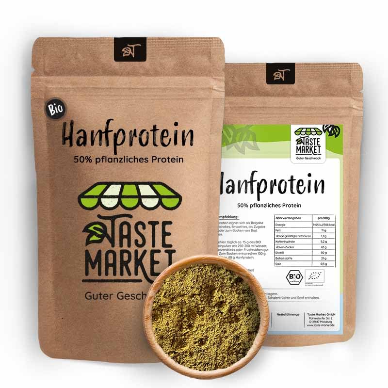 Discover our new organic hemp protein powder, which is obtained from the seeds of the hemp plant.Especially if you are enthusiastic about sports and are targeting a few extra proteins, the hemp protein powder from controlled organic cultivation will convince you.Hemp protein is a purely vegetable protein source with 50 protein, which, with its pleasantly nutty taste, makes itself wonderful in your protein shake and as an alternative to other protein powders. For a protein -containing start to the day, the organic hemp protein can be integrated into your breakfast.Mixed in a fruity smoothie, a smoothieowl, in your porridge or in a yogurt and then topped with fruits.With its slightly nutty aroma, you can also use the protein powder wonderfully to bake pancakes, waffles, cakes or cookies.100 g wheat flour corresponds to approx. 80 g of hemp protein, which is also gluten -free.As a snack for in between, the organic hemp protein also makes itself fabulous as an ingredient in protein bars and energy. For a protein shake you simply give 300 ml plant milk with a banana, 15 g from our organic hemp protein powder and a pinch of cinnamon to the mixer and et voilà, you can already taste your shake. Ingredients ingredients Hemp protein powder from controlled organic cultivation Warnings Store cool, dry and protected by light.Can contain traces of gluten, eggs, soy, milk, shell fruits and mustard.The nutritional values, text descriptions, or other representations may differ minimally from the goods actually delivered.This product is sold under food law requirements.We do not check any other applications.These analysis values are subject to the biological fluctuations that are common in natural products. MoreYour order - freshly packed: Immediately after your order, our products in our own manufacturer button are filled with a lot of care.We attach great importance to high quality and hygiene standards.Your goods come out of force paper in the practical resealable bag and will be sent with the DHL.teste Market - your marketplace for good taste!With us you get high -quality products from all over the world - also from controlled organic cultivation.And also: Each of our products is available in many different packaging sizes-from the small trial pack of 100 g, over 1 kg and 5 kg to sack goods, we are the right size for everyone.Do you have any questions about our productsFeel free to contact our customer service.For a protein shake you simply give 300 ml plant milk with a banana, 2 tablespoons of the organic hemp protein powder and a pinch of cinnamon in the mixer and et voilà, you can already taste your protein shake.Mixed in a fruity smoothie, a smoothiewowl, in your porridge or into a yogurt and then topped with fruits.With its slightly nutty aroma, you can also use the protein powder wonderfully to bake pancakes, waffles, cakes or cookies.100 g wheat flour corresponds to approx. 80 g of hemp protein, which is also gluten -free.As a snack for in between, the organic hemp protein also makes itself fabulous as an ingredient in protein bars and energy.5 kg organic hemp protein,Vegetable protein powder,50 protein content vegan,Discover our new organic hemp protein powder, which is obtained from the seeds of the hemp plant.Especially if you are enthusiastic about sports and are targeting a few extra proteins, the hemp protein powder from controlled organic cultivation will convince you.Hemp protein is a purely vegetable protein source that, with its pleasantly nutty taste, is wonderful in your protein shake.Entdecke unser neues BIO Hanfprotein Pulver, welches aus den Samen der Hanfpflanze gewonnen wird. Besonders wenn du sportbegeistert bist und es auf ein paar extra Proteine abgesehen hast, wird dich das Hanfproteinpulver aus kontrolliert biologischem Anbau überzeugen. Hanfprotein ist eine rein pflanzliche Proteinquelle mit 50 Eiweiß, die sich mit ihrem angenehm nussigen Geschmack wunderbar in deinem Proteinshake und als Alternative zu anderen Proteinpulvern macht. Für einen eiweißhaltigen Start in den Tag kann das Bio Hanfprotein hervorragend in dein Frühstück integriert werden. In einem fruchtigen Smoothie, einer Smoothiebowl, in deinem Porridge oder in einen Joghurt gemixt und anschließend mit Früchten getoppt. Mit seinem leicht nussigen Aroma kannst du das Proteinpulver auch wunderbar zum Backen von Pancakes, Waffeln, Kuchen oder Kekse benutzen. Dabei entsprechen 100 g Weizenmehl ca. 80 g Hanfprotein, welches obendrein noch glutenfrei ist. Als Snack für zwischendurch macht sich das Bio Hanfprotein außerdem fabelhaft als Zutat in Proteinriegeln und Energieballs. Für einen Proteinshake gibst du einfach 300 ml Pflanzenmilch mit einer Banane, 15 g von unserem Bio Hanfproteinpulver und eine Prise Zimt in den Mixer und et voilà, schon kannst du dir deinen Shake schmecken lassen. INHALTSSTOFFE ZUTATEN Hanfproteinpulver aus kontrolliert biologischem Anbau WARNHINWEISE Kühl, trocken und lichtgeschützt lagern. Kann Spuren von Gluten, Eiern, Soja, Milch, Schalenfrüchte und Senf enthalten. Die Nährwerte, Textbeschreibungen, oder andere Darstellungen können minimal von der tatsächlich gelieferten Ware abweichen. Dieses Produkt wird unter lebensmittelrechtlichen Anforderungen verkauft. Anderweitige Anwendungen werden von uns nicht geprüft. Diese Analysewerte unterliegen den bei Naturprodukten üblichen biologischen Schwankungen. MehrDeine Bestellung – frisch abgepackt: Direkt nach deiner Bestellung werden unsere Produkte in unserer eigenen Taste Manufaktur mit viel Sorgfalt von Hand abgefüllt. Dabei legen wir großen Wert auf hohe Qualitäts- und Hygienestandards. Deine Ware kommt im praktischen wiederverschließbaren Beutel aus Kraftpapier und wird mit der DHL versendet. TASTE MARKET – Dein Marktplatz für guten Geschmack! Bei uns bekommst du hochwertige Produkte aus aller Welt – auch aus kontrolliert biologischem Anbau. Und außerdem: Jedes unserer Produkte gibt es in vielen verschied