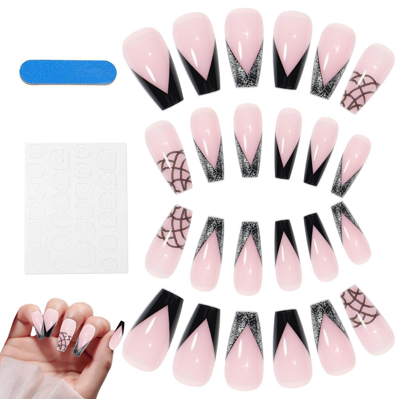 : Just sand the nail bed, apply the jelly glue we give away, press the fashion manicure, and get the manicure that girls will love. The jelly glue makes the fake nails reusable. Specification: Name: Press On False Nails Set Color: black pink Fake Nails Quantity: Packing size: about 15 8 3cm 5.91 3.15 1.18inch Package List: Press On False Nails Jelly Glue Sticker 1 Sheet Nail File 1 Notes: Due to the lighting effects and shooting angles, the color of the item and that shown in the picture might have nuance. Due to manual measurement, there might be tolerance in the product size.?Perfect Gift: These Long Fake Nails With Glue are the perfect gift for girlfriends, wives, women, and girls. Suitable for parties, dances, dates, weddings, etc. ?Warm Note: Our False Nails will last longer if you clean your nails before using them. You also buy extra glue for better wearing effect, please use suitable glue according to different scenes. ?Easy To Operate: You can change your nail style anytime, anywhere in 15 minutes without spending lot of time and money in nail salon with our False Nails With Designs. ?Value Package: There are of fake nail pieces, nail file, and jelly glue sticker. While jelly glue is not as durable as liquid glue, it makes fake nails reusable. ?Friendly Material: Made of high-quality ABS and resin materials, these Press On False Nails are safe to use, odorless, friendly, and don't hurt your hands.