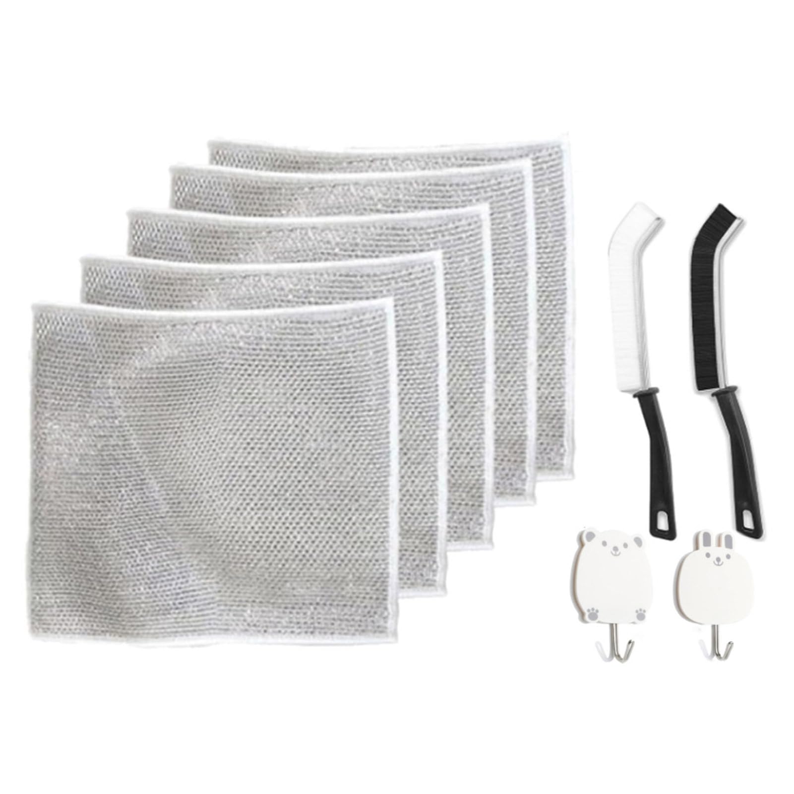 Our Non-Scratch Wire Dishcloth provides powerful cleaning performance without damaging surfaces. The fine pore design ensures strong foaming ability and is made of innovative fish scale plaid fabric. This reusable cloth is for wiping kitchen utensils, vehicles, electronics, and more! Specification: Product: Multifunctional Non-scratch Wire Dishcloth : PVA Product size: (approx.)20 20cm 7.87 7.87 inches Weight: 200g Pack list: Multifunctional Non-scratch Wire Dishcloth 5 Brush 2 Hook 2Exceptional Durability: Enjoy the durability and reusable nature of our multifunctional non-scratch wire dishcloth. Withstands hundreds of washes without falling apart, saving you money and reducing waste. Don't worry about fraying with our overlock seams that ensure long-lasting performance. Suitable Application: Delightful efficiency comes with the versatile wire dishcloth, widely used for cars, electronics, utensils, and more. Its durable and flexible design ensures dependable performance, making it must-have in your kitchen cleaning tools. Enhance Your Cleaning Skills: Introducing our multifunctional non-scratch wire dishcloth, equipped with fine pore design for strong foaming ability when wet. Use it wet to effectively clean plates and pots, or switch to make hassle-free grill and stove cleaning. Non-Scratch Cleaning: With our Non-Scratch Wire Dishcloth, tough stains like rust and oil can be removed effortlessly using powerful lattice weaving technology, ensuring your pots and pans remain unharmed. The high-quality wire material ensures exceptional cleaning performance, without harming your hands in any way. Efficient Kitchen Cleanliness: Crafted with fish scale plaid fabric, this dishcloth absorbs water instantly and dries quickly, providing effortless cleaning and well-maintained kitchen.