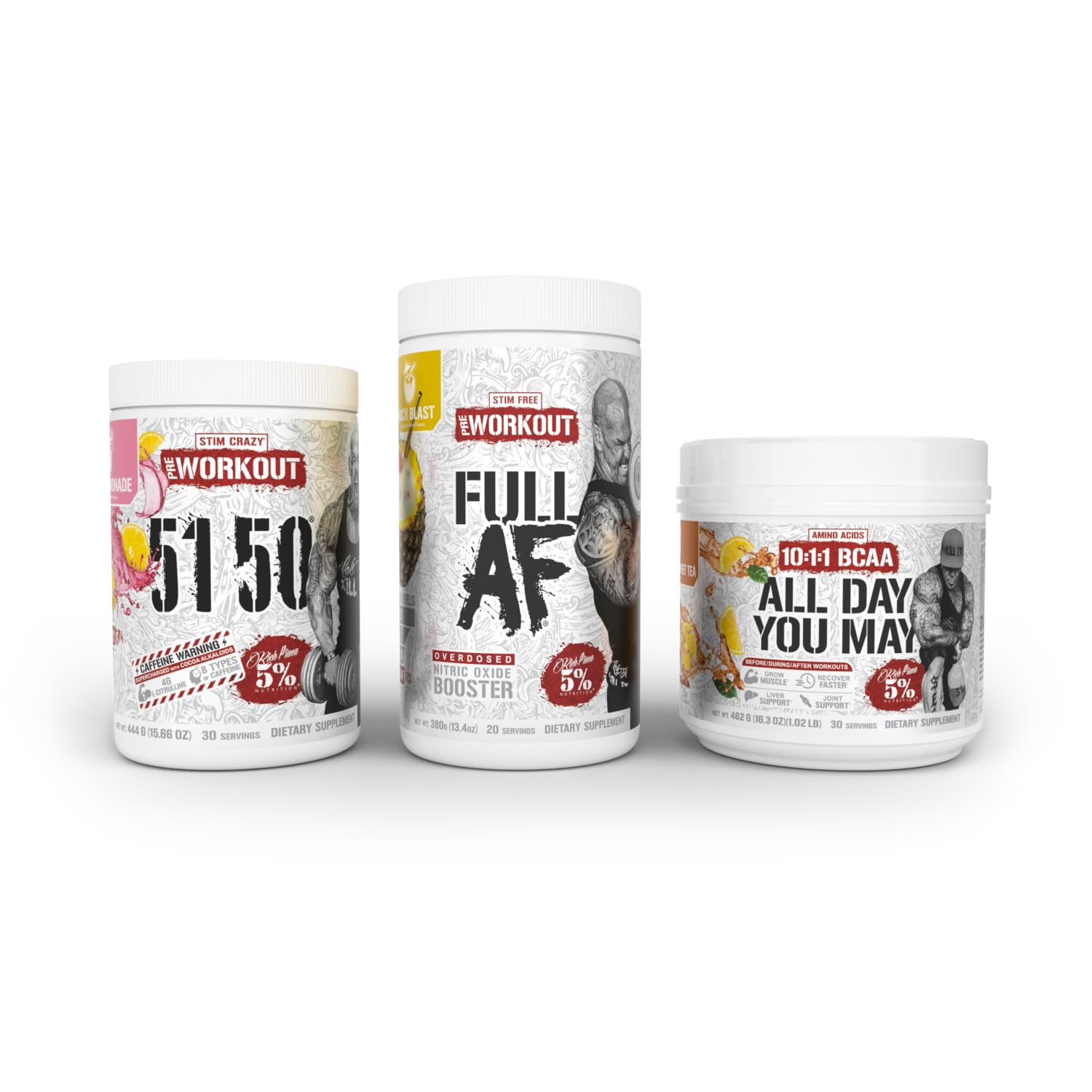 5% Nutrition Rich Piana 3-Stack | 5150 High-Stim Pre-Workout + FullAF Stim-Free Pre-Workout + AllDayYouMay Amino Acids BCAAs (Choose Your Flavors) 5150 + FullAF + ADYM