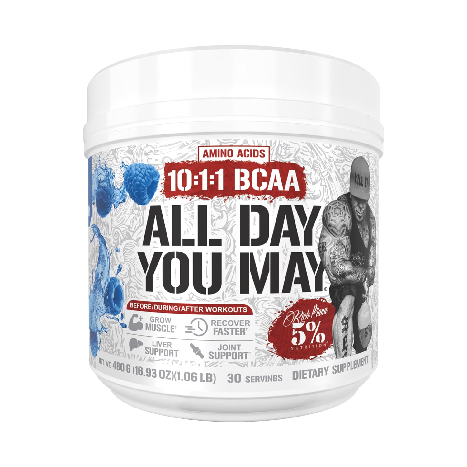 5% Nutrition Rich Piana AllDayYouMay BCAA Powder | Premium Intra & Post Workout Amino Acids EAA Electrolytes | Hydration Endurance Recovery | Vegan & Keto | 16.93 oz 30 Srvgs (Blue Raspberry)