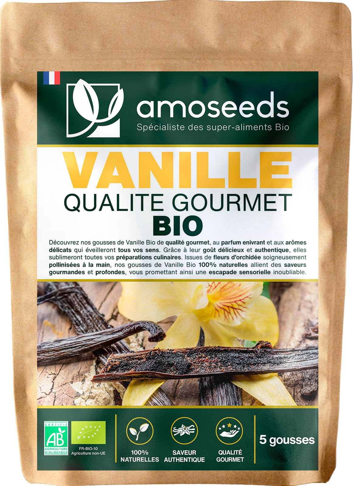 ✓ CERTIFIED ORGANIC: Resealable Kraft bag containing amoseeds Gourmet Quality Organic Vanilla Beans. 100 natural, pure, vegan product, no additives, no preservatives, no GMOs, no pesticides, no artificial flavors, no lactose, no soy and no gluten. Each batch is tested by third parties to ensure their quality and purity. ✓ LONG STORAGE: Our Organic Vanilla Beans are placed in resealable kraft bags with a 100 airtight aluminum lining. You can store your Organic Vanilla Beans in their original packaging for up to 24 months without them drying out or losing their flavor. ✓ 100 PURE AND NATURAL: Our Organic Vanilla Beans come from the orchid plant cultivated according to meticulous traditional know-how. Each pod is hand-picked with the greatest care before undergoing a natural maturation process. This results in pods measuring 11 to 15cm, fleshy, very fragrant, with powerful natural aromas and no preservatives. ✓ HIGH GOURMET QUALITY, INTENSE FRAGRANCE: we have selected Gourmet quality Vanilla pods so that you can enjoy all the deep and gourmet aromas of this exceptional spice. Their intense fragrance and rich flavors will even allow you to make homemade vanilla sugar. ✓ AUTHENTIC, GOURMET FLAVOR: our Organic Vanilla pods are full of small black beans with an intense fragrance and gourmet flavors. Thanks to their caramelized and slightly floral notes, these pods will enhance your crème brûlées, custards, flan, cakes, tiramisus and other desserts!✓ CERTIFIÉES BIOLOGIQUES : sachet Kraft refermable contenant des gousses de Vanille Bio de Qualité Gourmet amoseeds. Produit 100 naturel, pur, vegan, sans additifs, sans conservateurs, sans OGM, sans pesticides, sans arômes artificiels, sans lactose, sans soja et sans gluten. Chaque lot est testé par des tiers afin de s'assurer de leur qualité et leur pureté. ✓ LONGUE CONSERVATION : nos gousses de Vanille Bio sont placées dans des sachets kraft refermables dotés d'une doublure en aluminium 100 hermétique. Vous pouvez ainsi conserver vos gousses de Vanille Bio dans leur emballage d'origine jusqu'à 24 mois sans qu'elles ne se dessèchent ou ne perdent en saveurs. ✓ 100 PURES ET NATURELLES : nos gousses de Vanille Bio sont issues de la plante d'orchidée cultivée selon un savoir-faire traditionnel minutieux. Chacune des gousses est récoltée à la main avec le plus grand soin avant de passer par un processus de maturation naturel. Cela permet d'obtenir des gousses de 11 à 15cm, charnues, très parfumées, aux arômes naturels puissants et sans conservateurs. ✓ HAUTE QUALITÉ GOURMET, PARFUM INTENSE : nous avons sélectionné des gousses de Vanille de qualité Gourmet afin que vous puissiez profiter de tous les arômes profonds et gourmands de cette épice d'exception. Leur parfum intense et leur richesse en saveurs vous permettront même de réaliser du sucre vanillé maison. ✓ SAVEUR AUTHENTIQUE, GOURMANDE : nos gousses de Vanille Bio regorgent de petits grains noirs au parfum intense et aux saveurs gourmandes. Grâce à leurs notes caramélisées et légèrement florales, ces gousses sublimeront vos crèmes brûlées, crèmes anglaises, flan, cakes, tiramisus et autres desserts !.