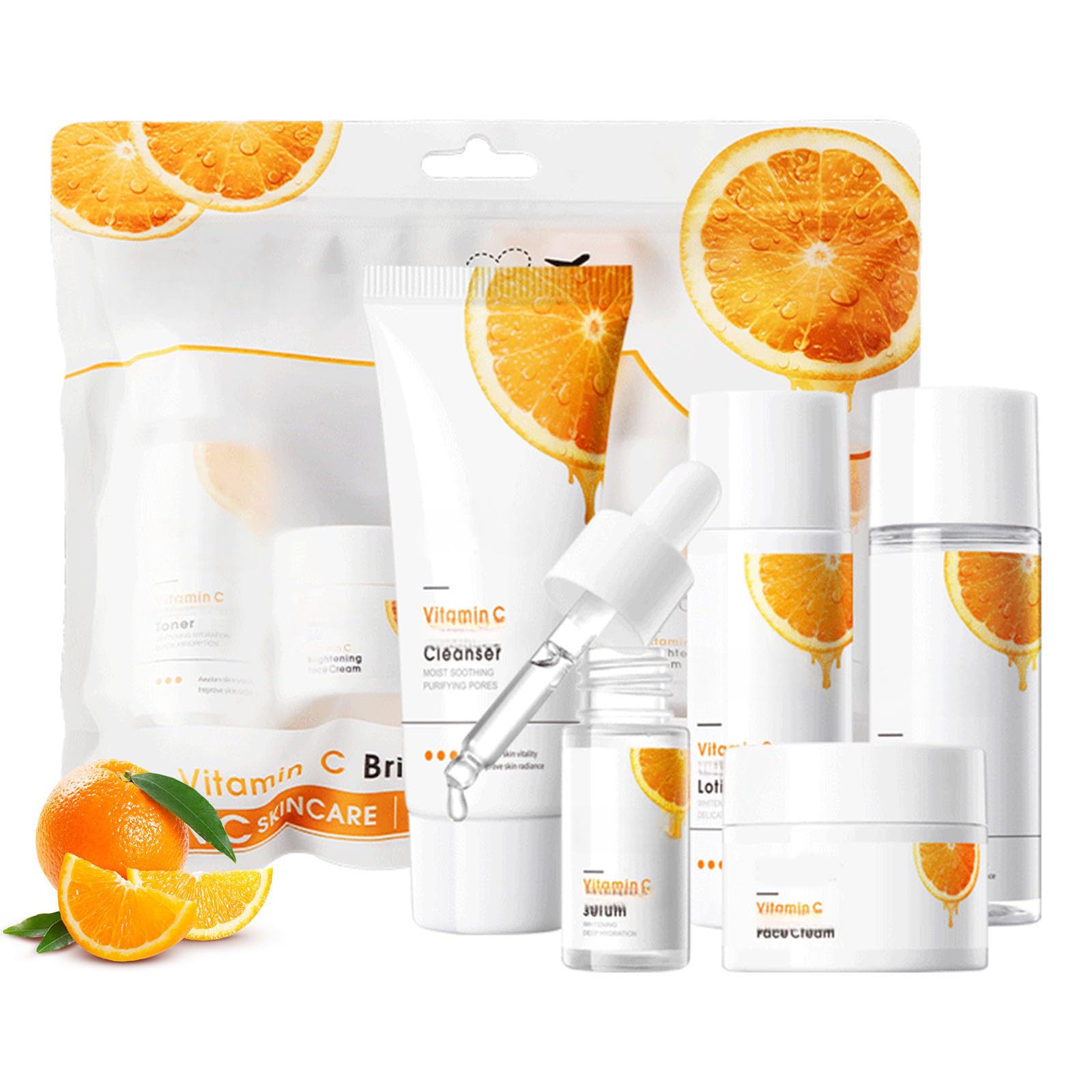 Name: 5-Piece Vitamin C Hydrating Skincare Set Net Weight: Cleanser: 30 g 1.05 ounce Toner: 30 ml 1.01 fl.oz Lotion: 30ml 1.01 fl.oz Serum: 10ml 1.01 fl.oz Face Cream: 15 g 0.53 ounce Features: 5-in-1 skincare – cleanses, hydrates, moisturizes, repairs, and stabilizes skin, all in one set, providing 24-hour long-lasting skincare, perfect for travel. ? Effectively cleanses without drying. ? Firms skin and minimizes pores. ? Basic moisturizing, non-sticky. ? Deeply penetrates the skin for maximum effect. ? Women's Skincare Gift Set. ? Suitable for normal, dry, oily, and sensitive skin. How To Use 1. First, cleanse your face with a facial cleanser and pat dry. 2. Gently pat toner onto your face and allow it to fully absorb. Then, apply a serum to your face. 3. At night, if your skin is very dry, apply a face cream directly. During the day, you can use lotion instead of face cream.A THOUGHTFUL GIFT: This 5-piece skincare set is not only suitable for personal use but also a thoughtful present for family and friends. It's especially suitable for holiday gifts like Christmas or New Year's, bringing warmth and care to loved ones. The simple yet elegant packaging conveys care and love. HIGH-EFFICIENCY REPAIR: The vitamin c serum provides powerful repair benefits, promoting skin's self-repair and strengthening the skin barrier. Regular use helps improve the overall health of the skin, addressing fragility and making it more resilient and smooth. GENTLE CLEANSING: The cleanser in this facial kit has a gentle cleansing effect, effectively removing impurities without damaging the skin barrier. The gentle formula is suitable for all skin types, leaving skin refreshed and supple, providing a solid foundation for subsequent skincare steps. LOCKS IN HYDRATION: The skincare products in this set are rich in Vitamin C, helping to provide long-lasting hydration, replenishing the skin's moisture needs, and leaving it feeling supple and soft. It's especially suitable for dry seasons, effectively relieving dryness and tightness. TRAVEL ESSENTIAL: This compact and elegant Vitamin C skin care set is perfect for travel. Whether it's a short business trip or a vacation, it provides a comprehensive skincare experience. The five-piece design is easy to carry, avoiding the hassle of bulky bottles and jars.