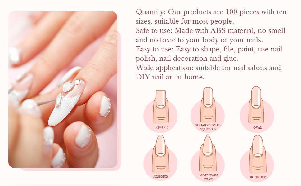 500 Pieces acrylic false nails: The fake nails are made with ABS material, no smell and no toxic to your body or your nails; Designed with translucent color and different size with moderate length and thickness, easy to shape, file, paint and apply with glue and nail polish decorations. Usage: They are great for nail art learner and specialist, suitable for nail salons and DIY nail art at home; Great gift for your wife, girlfriend, mother or sisters and take part in the party, dating, wedding etc. Application: 1. File the sides and cuticle area for an accurate fit with manicure stick; 2. Clean nails of any polish oil with acetone-based polish remover; 3. Select the correct size nails for each finger; 4. Apply glue to nails; 5. Apply thin layer of glue to nails; 6. Starting at cuticle, press on and hold for 5 seconds; 7. File and shape your new nails if needed. Specifications: Color: translucent Material: ABS Size: 10 size, 50 pieces tips each size Package includes: 500 x False nail tips 1 x Box Note: If you have any questions, please contact with our customer service, they will answer your question happily and carefully. DIRECTIONS File the sides and cuticle area for an accurate fit with manicure stick; Clean nails of any polish oil with acetone-based polish remover; Select the correct size nails for each finger; Apply glue to nails; Apply thin layer of glue to nails; Starting at cuticle, press on and hold for 5 seconds; File and shape your new nails if needed.