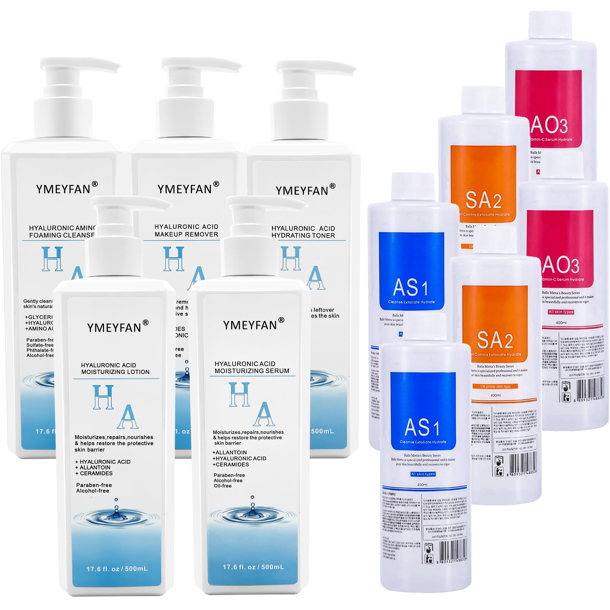 500ml Hyaluronic Acid Skincare Set 5 Bottle (Makeup remover, cleanser, toner, serum, lotion) 6 Bottles AS1 SA2 AO3 Hydrate Facial Solution