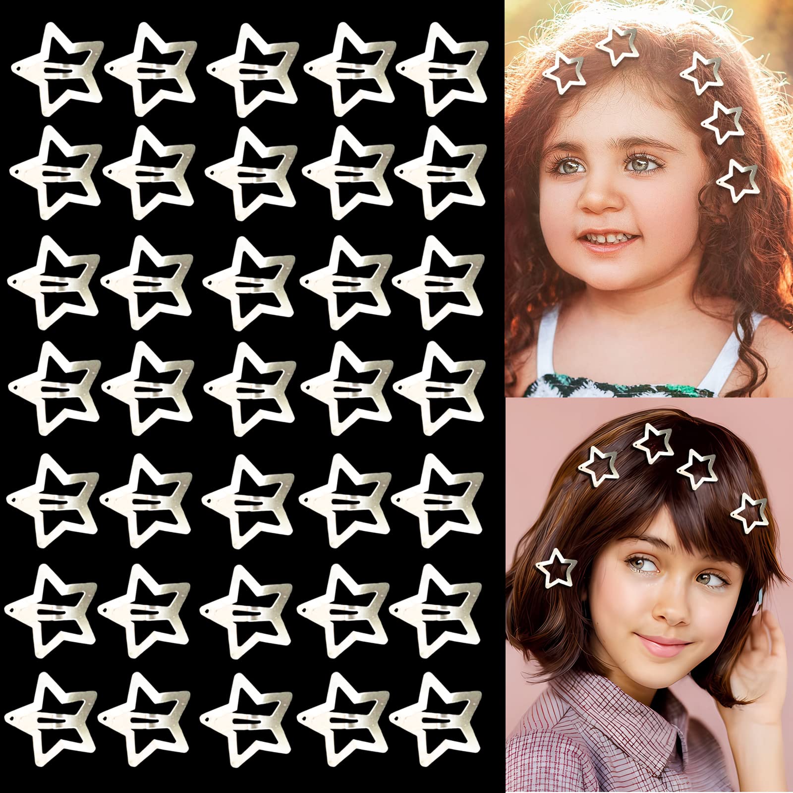 Star Hair Clips y2k: Choose these adorable kids star clips to decorate your children meatball hair, ponytail or braids, making your girls to be more lovely and eye-catching. Occasion: Comfortable for daily wear, girls star hair pins also could wear at baby shower, party, school, picnics or outdoor activities. Material: These star barrettes are made of alloy, lightweight, resist dropping, hold on well on kids hair. Kids Star snap clips: Comes with 50PCS 1.25 inch silver star snap hair clips, sufficient to match girls outfit and hairstyle.