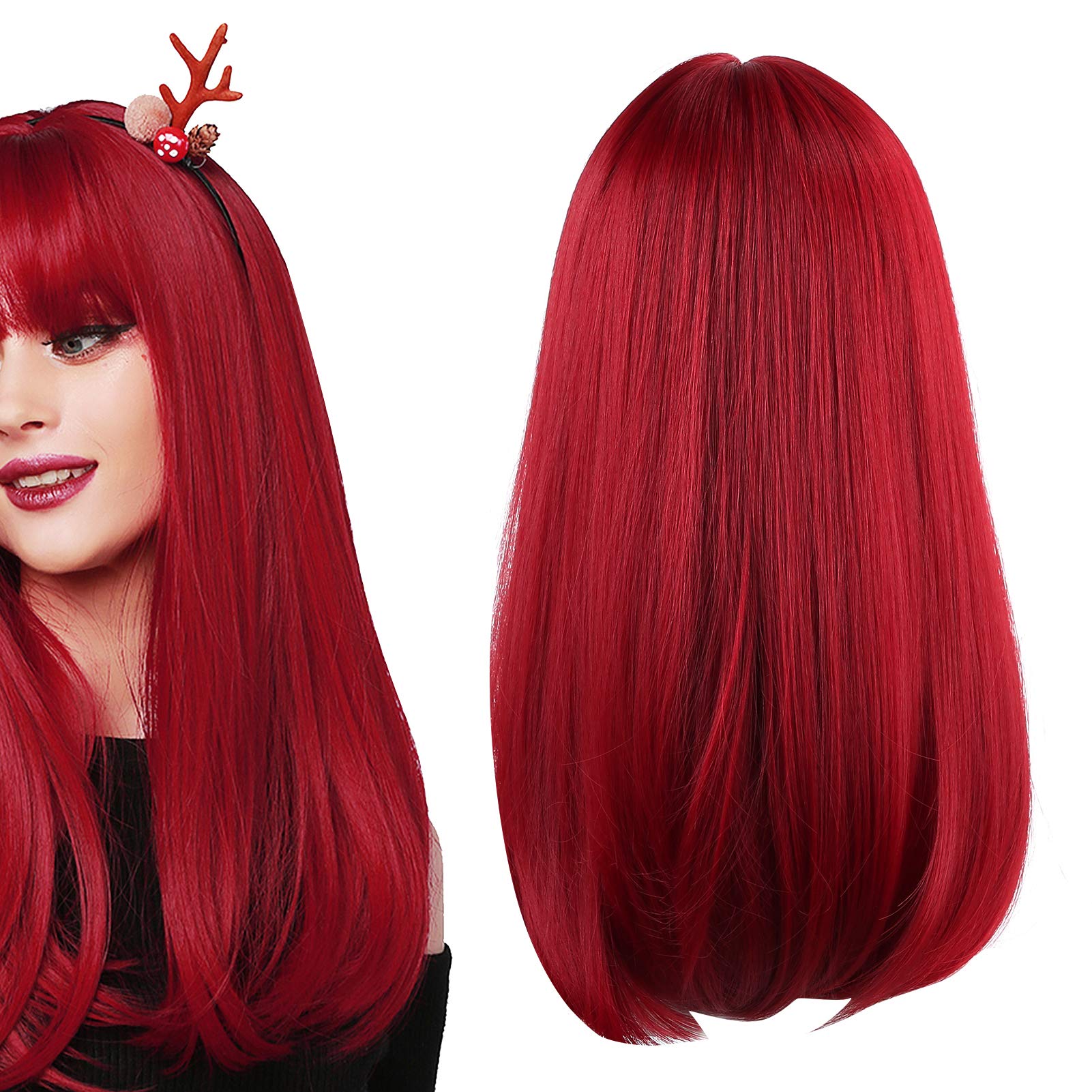 52cm Rote Lange Gerade Perücke, Farbenes Kunsthaar mit Geradem Knall für Frauen, Hitzebeständige Faser Wig, für die Tägliche Party Cosplay Verwendung