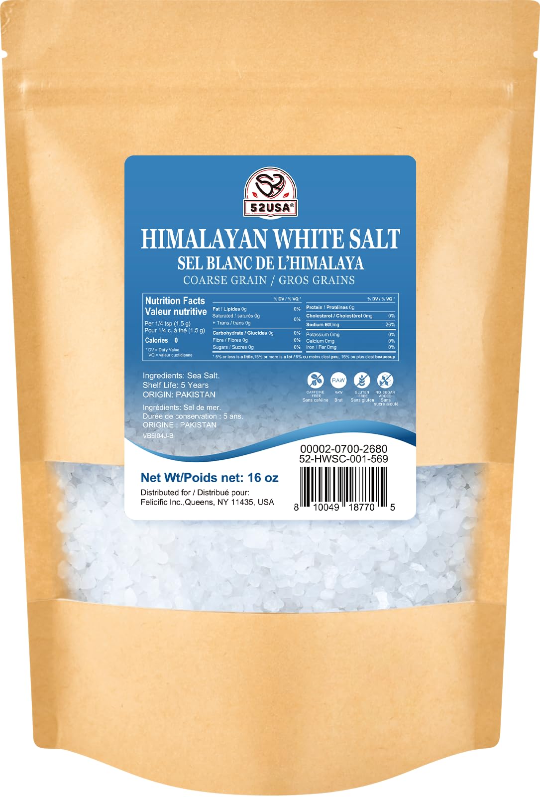 52usa Sel blanc de l'Himalaya à gros grains, sans OGM, sel casher, 0,5 kg
