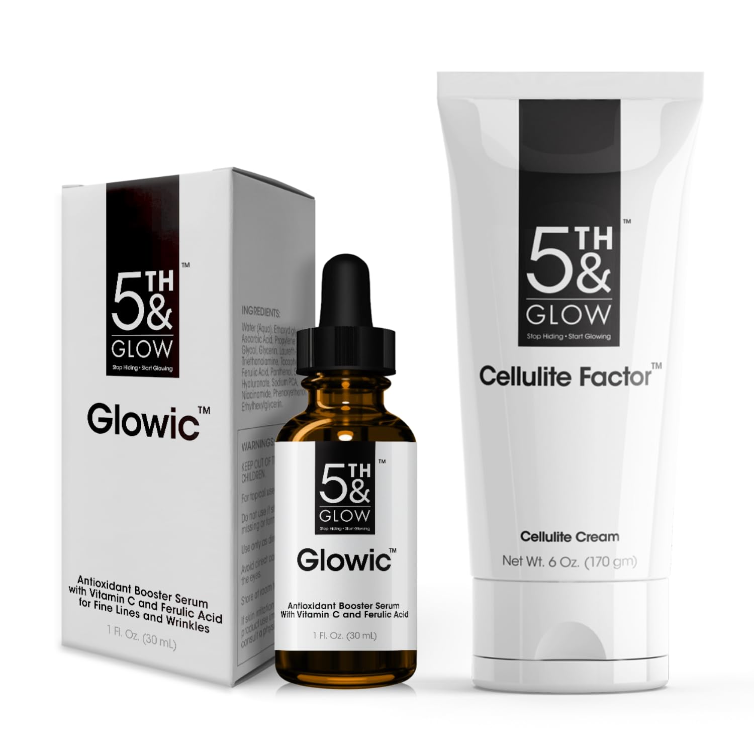 5th & Glow Beauty Care Set - Glowic Antioxidant Serum for Fine Lines & Wrinkles + Cellulite Factor Cream for Stomach & Thighs - Reduces the Appearance of Cellulite Dimples for Smooth Toned Skin