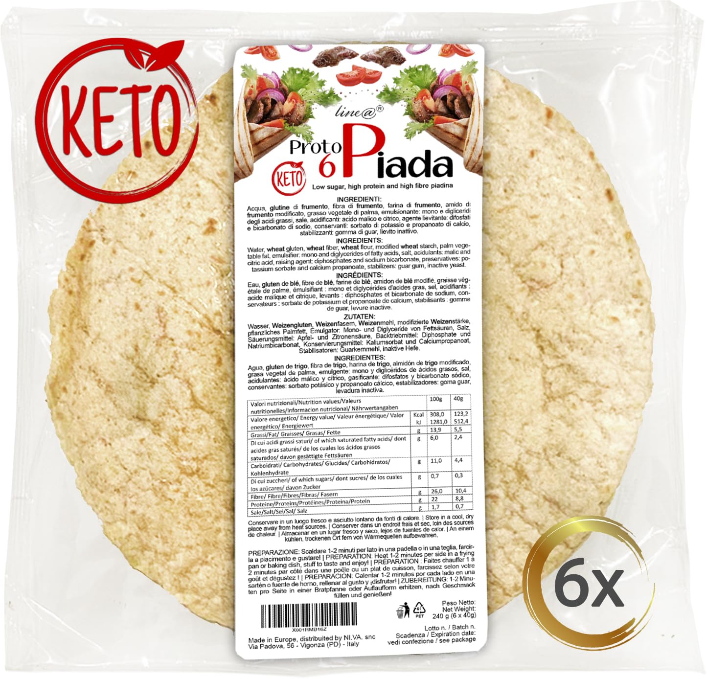 Delicious, soft, and easy to prepare, this piadina is excellent as a side dish. High in protein, low in calories, and sugar-free, it can be enjoyed at any time of day, from breakfast to dinner, during the first phase of your protein diet. INGREDIENTS Water, wheat gluten, wheat fiber, wheat flour, modified wheat starch, palm vegetable fat, emulsifier: mono- and diglycerides of fatty acids, salt, acidifiers: malic and citric acids, raising agents: diphosphates and sodium bicarbonate, preservatives: potassium sorbate and calcium propanoate, stabilizer: guar rubber, inactive yeast. COOKING INSTRUCTIONS Cook the piadina in a hot pan for two minutes, turning it occasionally. Fill it however you like! SAFETY WARNING Produced in a facility that also processes lupin, tree nuts, sesame, eggs, milk, gluten, oats, and soy. Store in a cool, dry, well-ventilated place away from heat and sunlight. See more6 PROTOPLADE KETO Line diet PIÈCES KÉTOGÉNIQUES à haute teneur en protéines PHASE 1 1 lot de 6 PIADINES de 40 g 6 Piadine (1 pack, 240g)DESCRIPTION DU PRODUIT DESCRIPTION DU PRODUIT Délicieux, moelleux, simple à préparer, excellent pour accompagner chaque plat. à haute teneur en protéines, avec peu de calories et sans sucre, vous pouvez accompagner à tout moment de la journée, du petit déjeuner au dîner, de la première phase de votre régime alimentaire protéiné INGRÉDIENTS Eau, gluten de blé, fibre de blé, farine de blé, amidon de blé modifié, graisse végétale de palme, émulsifiant : mono-et diglycérides d'acides gras, sel, acidifiants : acide malique et citrique, agent levant : diphosphates et bicarbonate de soude, conservateurs : sorbate de potassium et propanoate de calcium, stabilisé Matériaux : caoutchouc de guar, levure inactive. MODE D'EMPLOI Faites cuire la piadina dans une poêle bien chaude pendant deux minutes en la tournant de temps en temps. Farcisz-la en laissant libre cours à votre imagination AVERTISSEMENT DE SÉCURITÉ Produit dans un établissement qui utilise également du lupin, des fruits à coque, du sésame, des œufs, du lait, du gluten, de l'avoine et du soja. Conserver dans un endroit frais, sec et bien aéré loin de la chaleur et à l'abri de la lumière du soleil. Voir plus