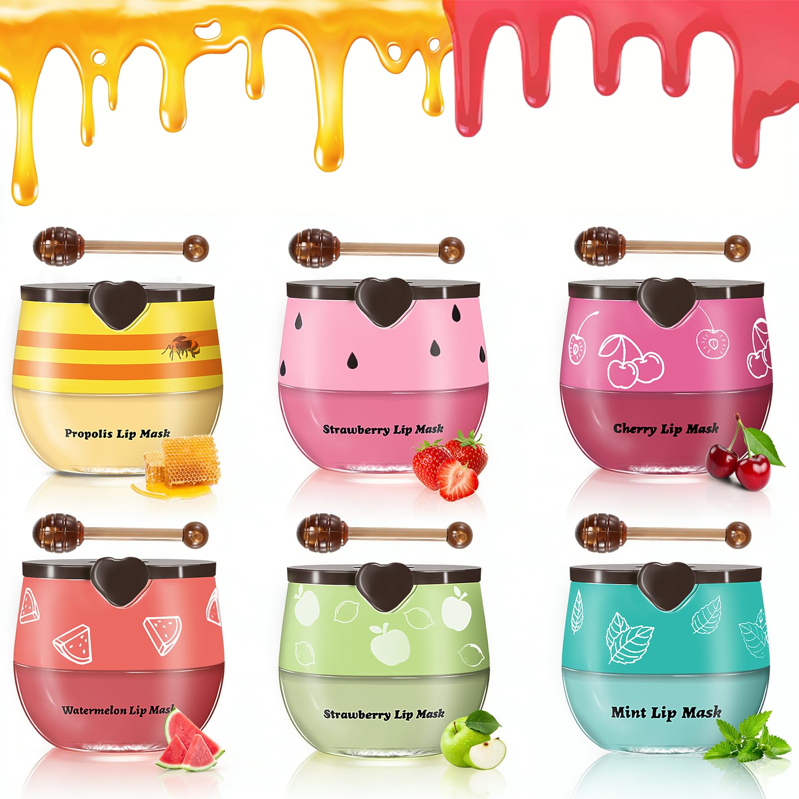 6 Pcs Bee Lip Balm Honey Pot-Honey Strawberries Watermelon Apples Cherries Mint Propolis Lip Mask Overnight Nourishing Hydrating Lip Balm Preventing Dry & Cracked Lips Reduce Lip Lines