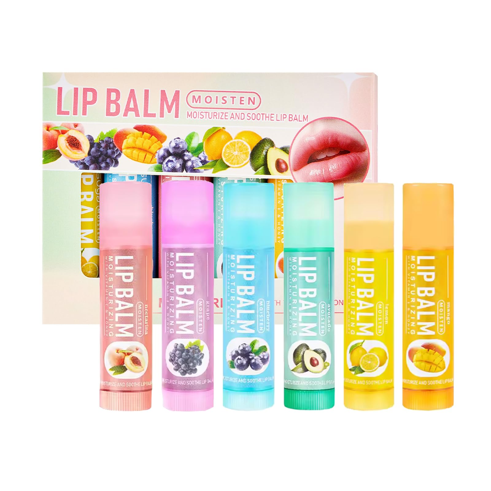 High cost-performance gift box set: With an affordable specification of 6 pieces, it offers 6 popular flavors and professional lip care functions. It is suitable for personal use (can be placed in different places such as home, office, and bag), and can also be used as a small gift for festivals (such as sharing with best friends or Christmas souvenirs). Mild formula suitable for the whole family: Made from non-scented and non-irritating fruit extracts, it has passed strict safety tests and is suitable for pregnant women, children and people with sensitive skin, meeting the high requirements for healthy skin care products. Portable small sticks are suitable for multiple scenarios: With a design of 6 independent small sticks, it is convenient to carry around and can be easily put into a pocket, handbag or car, meeting the needs of touch-up painting in different scenarios such as commuting, dating and outdoor sports. Five-layer repair power to protect your lips to the end: Integrating moisturizing and hydrating, preventing dryness and cracking, reducing lip lines, and soothing and repairing, it forms a long-lasting protective film for dry climates and frequent lip problems, alleviating rough and peeling lips and maintaining a hydrated state all day long. ?. Choose from 6 popular fruit flavors at will: This set includes 6 natural fruit flavors such as blueberry, grape, peach, mango, avocado and lemon, catering to different moods in daily life. The fresh aroma enhances the pleasure of use.