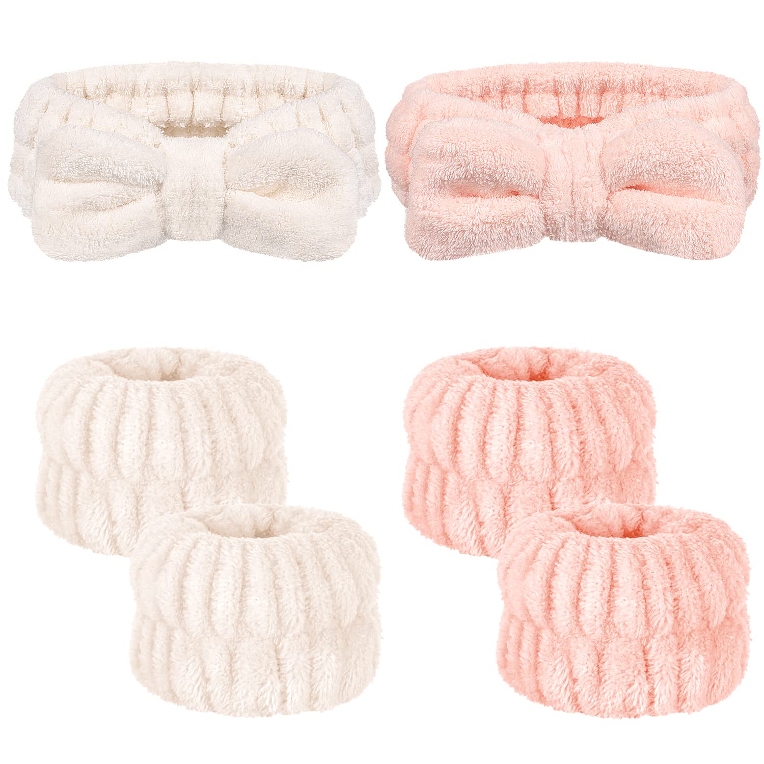 Warm Tips: Wash them before using because they have a little fluffies that come off at first, but they stop when you wash them!. Wide Occasions: This set of headband and wrist band are useful accessories for ladies and girls when doing spa, sports, yoga, face-washing, makeup and taking a shower. Good Elasticity: The absorbent wristband and head band has good elasticity, can be stretched to fit you better, can stay stable on most people's head and wrists. Diverse Usage: The comfortable headband helps to prevent hair from falling in front of your face and provide a barrier to keep your hair dry while washing face, the wrist band does the same, preventing liquids from spreading down your arms, allowing you to have a good using experience. Soft and Comfortable: The spa headband and wrist band are made of quality microfiber material, very light and durable, breathable to wear and comfortable to touch, they are friendly to your skin, you will love the nice experience of wearing them. Face Washing Headband and Wristband Set: You will receive 2 pcs microfiber bow headbands and 4 pcs wristbands, a practical combination for girls and women to apply in everyday life, you can share the headband with your mom, sister or other female friends.