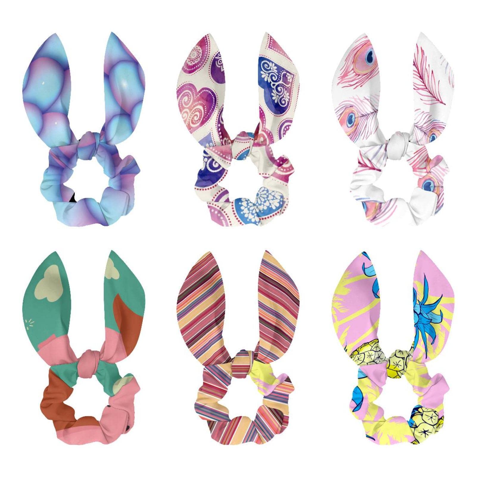 PACKAGE INCLUDES - 6 Bunny Bow Scrunchies. ?Material?These scarf scrunchies are made of polyester and rubber band. This bow knot ponytail can tie your hair well, it is easy to wear or take off. It can fix your hair up so well for a long time without loosening or falling out all together. ?Pretty and Colorful? The hair band ties contain 6 pieces different pattern colors of hair scarves. There’s so many colors that there must be one for you!!! 6Pcs Different Colors hair ropes fit any your outfits, which keep you be different everyday. ?Useful? This Scrunchy Bow knot a durable rubber band and a knotted bow of each hair band. Not only durable, hair tie holders with bows are smooth to easily wear on and take off, which can take good care of your hair. Elastic Scrunchies Ponytail can be used for hand decoration or handbag decoration. ?Wide Application?These scrunchies hair accessories are suit for women, girls, ladies, adults and children in daily wear, parties, proms, dance, dinner, sports, travel, Christmas, beach parties. ?Gifts?:6 Bunny Bow Scrunchies can be used as a wonderful gift for your friends and family for Birthday,Valentine’s Day, Mother’s Day, Halloween, Christmas, New Year. ?After-sales Service?: If you have any problems with hair products, please feel free to contact us. We will always be here to solve your problem immediately. Hope you enjoy our products!