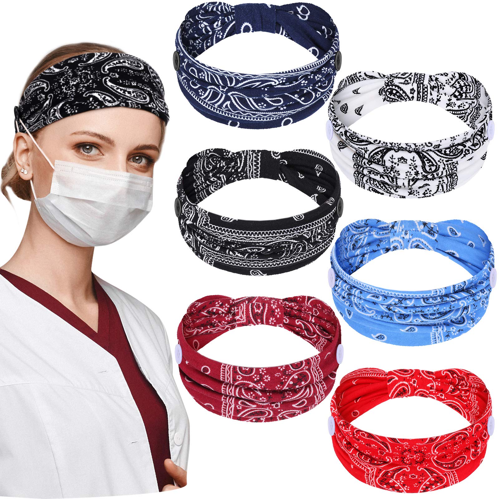 6 Pieces Nursing Headbands with Buttons for Nurses Doctor Women Boho Bandana Headbands Wide Stretch Head Wraps Elastic Hair Bands for Face Covering Holder Ear Protection (Classic Pattern)