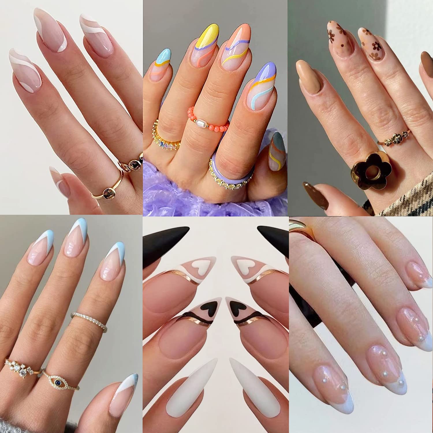 6 Sets Medium Press on Nails Almond,KXAMELIE Fake Nails With Nail Glue,Swirl Floral Heart Pattern French Design Glue on Nails Different Styles for Women Girls,144 pcs almond style