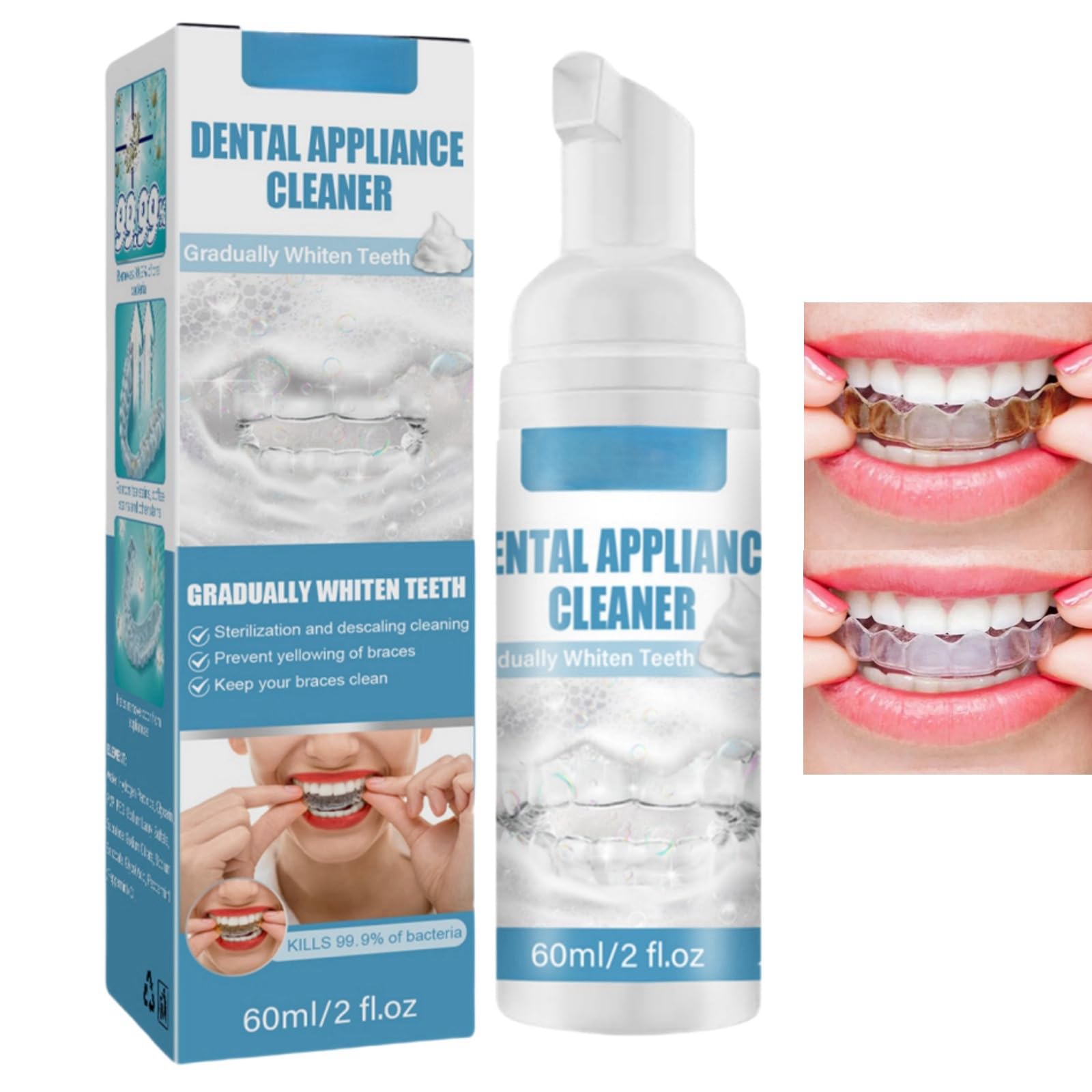 ?How to Use?This night guard cleaner is simple and easy to use, you just need to cover your braces with this braces foam cleanser and let every corner of the braces touch this retainer cleaner. Then bring my braces, this clear aligner cleaner does not need to be rinsed, this teeth care foam cleaner can make your braces clean. ?Widely Applicable?This aligner cleaner and whitener is designed for dental accessories, your braces or dentures can be cleaned with this toothbrush cleaner. Your dental cleaning can be done with just one bottle of this tooth guard cleaner. This braces foam cleanser does not require rinsing, this retainer whitening foam is practical and durable. ?Portable?This braces cleaner will not take up too much space for you, and this denture toothpaste for false teeth is small and lightweight, you can carry this dental plaque tablets with you. You can use this cleaner retainer at any time after eating out. The lightweight design of this tooth care foam cleaner allows you to use this product at any time. ?Formulation Safety?The formula used in this aligner cleaner is natural and safe, this retainer cleaners will not cause irritation to the mouth. You will feel comfortable using this mouthguard cleaner. This bright retainer cleaner tablets is mild and non-irritating, you can use this mouth guard cleaning tablets with confidence. ?Stain Removal?This 60ml retainer whitening foam is very effective in getting rid of stains on braces. This retainer cleaning foam for oral care is designed for braces, using this dental foam braces cleaner can help remove food residue, this teeth retainer cleaner helps keep braces hygienically clean. This mouth guard cleaner cleans whitens teeth&fights bad breath is very suitable for people who wear braces.