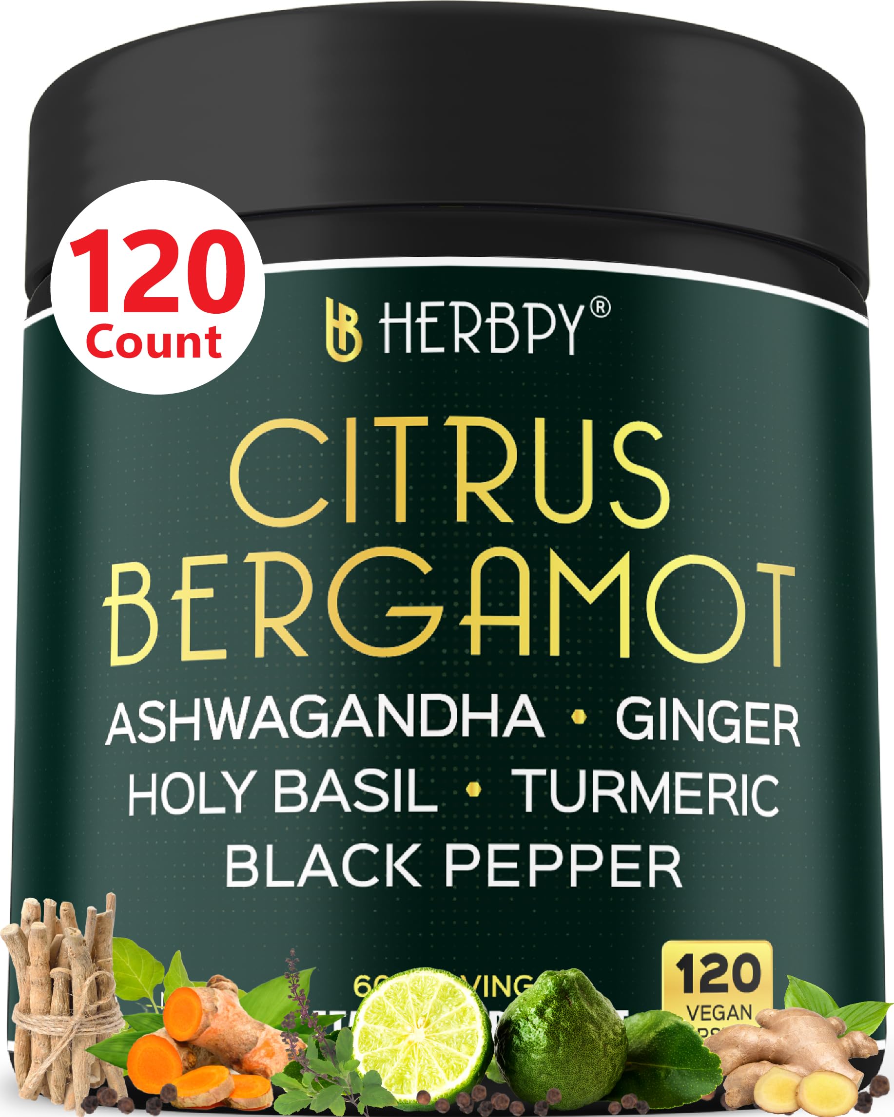 Quality Safety: Citrus Bergamot Extract Supplement from India, produced under strict standards. Commitment to satisfaction with 's refund return policy. Extract Citrus Bergamot capsules are manufactured in an FDA-registered facility, adhering to GMP, FSSAI, ISO, Kosher, and Halal standards. . Expiration Dosage: Citrus Bergamot Supplements, encased in vegetable cellulose capsules, 2-year expiration. Taking 2 pills Citrus Bergamot heart health supplement daily as part of a healthy lifestyle, supplying a potent blend of 6 herbal ingredients, rigorously tested for purity and safety. . Vegan-Friendly: Herbpy Bergamot citrus supplement offers 120 quick-release bergamot powder pills in a dark jar. Two pills daily support a balanced life, encouraging digestive comfort and a restful state of mind , provide a 60-day supply. Active Youthful Lifestyle Support : Made from pure Citrus Bergamot and Indian herbs, these Citrus Bergamot Capsules support healthy circulation naturally with Ashwagandha root, Holy Basil, and Black Pepper for enhanced absorption and vitality. . 6-Herb Powerhouse: Citrus Bergamot Powder, Ashwagandha extract, Holy Basil, Turmeric Curcumin, Ginger Root, and Black Pepper — made from pure and natural herbs, gluten-free, and non-GMO for premium natural health. Supports immune response, heart health digestion. Gifts from nature. .