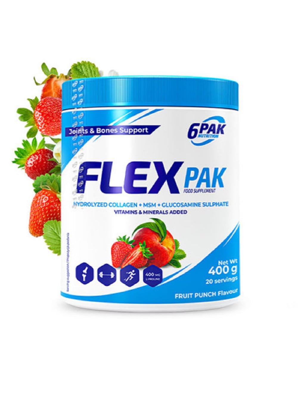 6Pak - Flex Pak - Collagène hydrolysé MSM Glucosamine Suplhate - Vitamines et minéraux - Soutien des articulations et des os - 400 g de poudre - Goût : (fraise)