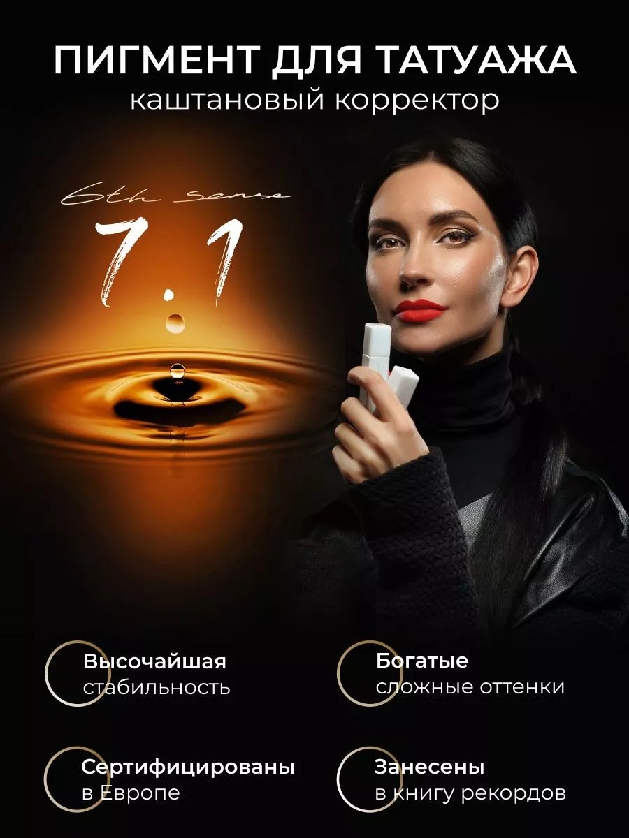 Пигмент для татуажа 6th Sense 7.1 (каштановый), по сути является корректором, самым светлым пигментом в палитре. Чаще всего корректоры для татуажа используют не совсем правильно, пытаясь перекрыть некрасивые оттенки противоположным по цветовому спектру цветом например зелёный перекрыть красным и наоборот, что может привести к печальным последствиям, так как невозможно вычислить какие пигменты, в каком количестве и в каких концентрациях находятся под кожей на момент перекрытия, и как вступит во взаимодействие вводимый пигмент. Корректоры для перманентного макияжа 6th Sense приводят в баланс старые остатки пигментов в коже, дополнив собой и тем самым оживив цвет. Если, к примеру, на серые брови положить корректор 7.1, то при заживлении вы получите благородный, каштановый оттенок, без лишних процедур удаления. Все остальные цвета, помимо черного и его оттенков, отлично перекрываются пигментами 6th Sense из классической линейки