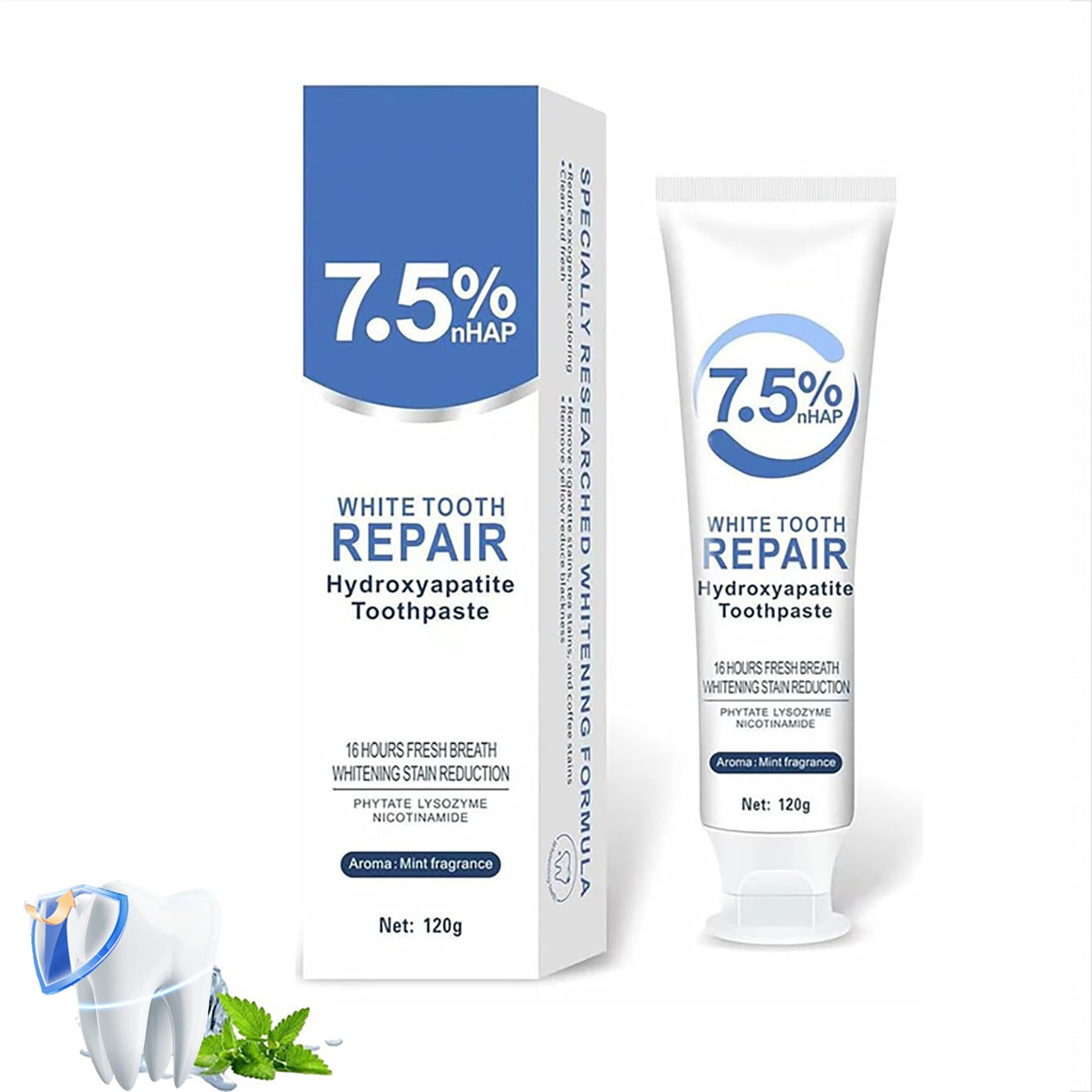 [Precautions for use]:Precautions for use: Use Hydroxyapatite Toothpaste every morning and evening, about 1 cm of paste each time, for 3 minutes. It is more effective when used with the Bass brushing method. If used continuously for more than 3 months, the enamel repair and anti-sensitivity effects will be more significant. [Promotes Oral Health]: Regular use Hydroxyapatite Toothpaste ,supports overall oral health by reducing plaquebuildup and preventing tooth decay,Perfect for the whole family. [Fluoride-Free and Gentle] Enjoy a fluoride-free toothpaste,for Advanced Enamel Protection , ensuring safe effective care Gently removes surface stains without damaging tooth enamel,helps maintain healthy gums. [Repairs Micro-damage]: Hydroxyapatite effectively repairs micro-damage on the toothsurface, enhancing overall tooth structure and durability, hydroxyapatite bonds with dentin tubules, reducing cold heat sensitivity and preventing gum irritation,Suitable for daily use on sensitive teeth?. [Strengthens Repairs Enamel Naturally?]: Enriched with hydroxyapatite(NHAP), A naturally occurring mineral, ourtoothpaste helps remineralize and strengthen tooth enamel, providing robust protectionagainst cavities and sensitivity.