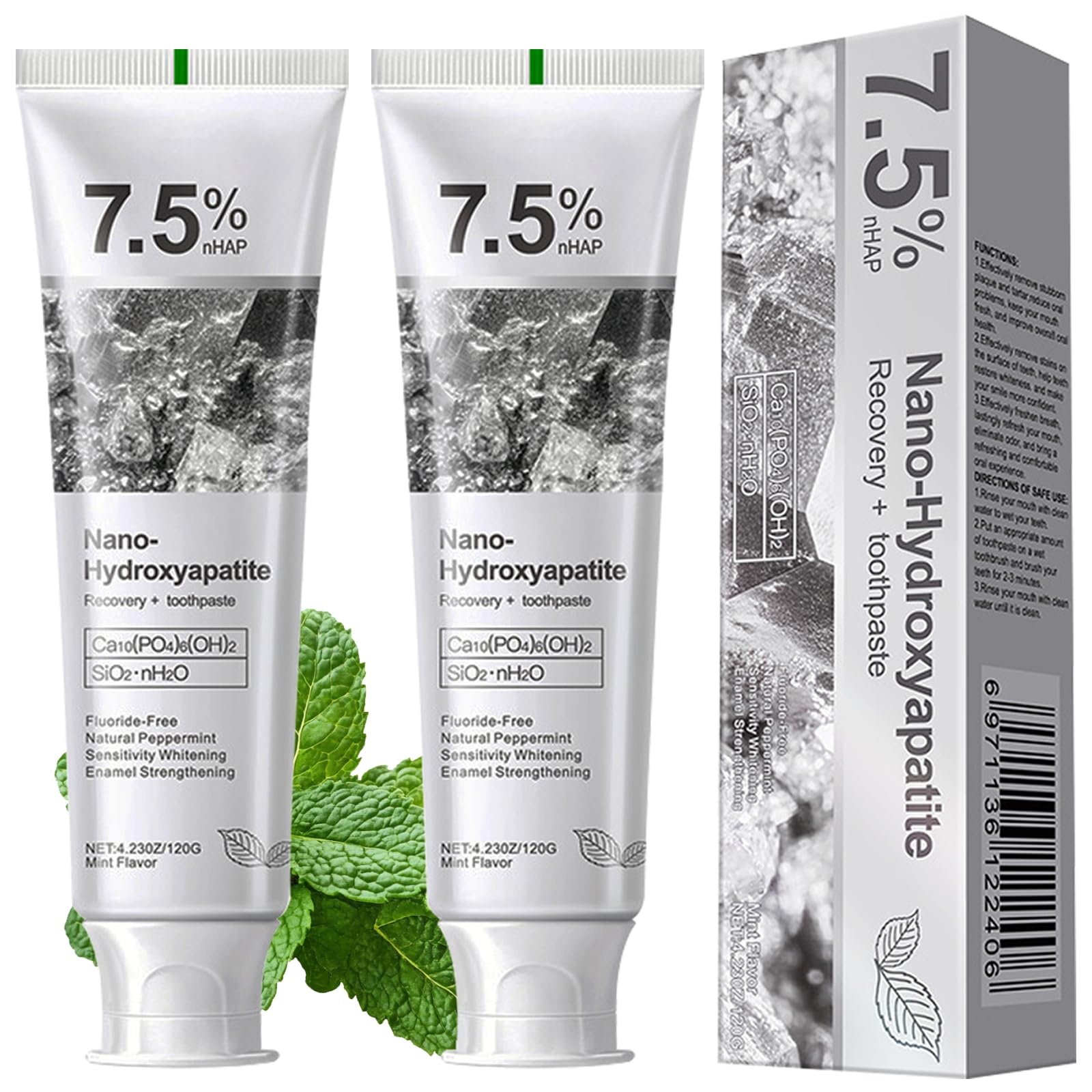 ?Natural Mint for Long-Lasting Fresh : The hidroxiapatita toothpaste neutralizes harmful oral bacteria and smoothes microcracks in tooth enamel, fundamentally addressing bad breath. The combination of natural mint and soothing green tea combats bad breath, ensuring 12-hour fresh breath for a vibrant, all-day experience. ?A Daily Oral Care Essential : 7.5 nano-hydroxyapatite toothpaste, designed for daily use, reduces tooth sensitivity in 2-4 days, gradually whitens stains in 2-4 weeks, and repairs micro-damage to tooth enamel in 3-5 weeks. Suitable for all ages, this toothpaste is both safe and effective, making it a must-have for overall oral hygiene and health. ?Fluoride-Free and Safe for Sensitive Teeth : Our 7.5 nano-hydroxyapatite toothpaste is specially formulated for those with sensitive teeth. Its pH-neutral hydroxyapatite and fluoride-free formula, free of harsh additives, help soothe sensitivity to cold, heat, and touch, eliminating brushing discomfort while ensuring a gentle clean. ?Promotes Enamel Protection : This hydroxyapatite toothpaste is formulated with powerful nano-hydroxyapatite, a natural mineral that helps effectively repair, strengthen and remineralize weakened tooth enamel, reducing daily wear and the risk of tooth decay. Thanks to the natural restorative properties of hydroxyapatite, it promotes long-term oral health. ?Deep Clean, Whiten Teeth : This nano hydroxyapatite toothpaste contains no harsh chemicals or abrasives, effectively removing plaque and tartar, including coffee, tea, and tobacco stains, without damaging tooth enamel, for a thorough clean. Safely and gently whitens teeth for a brighter smile!.