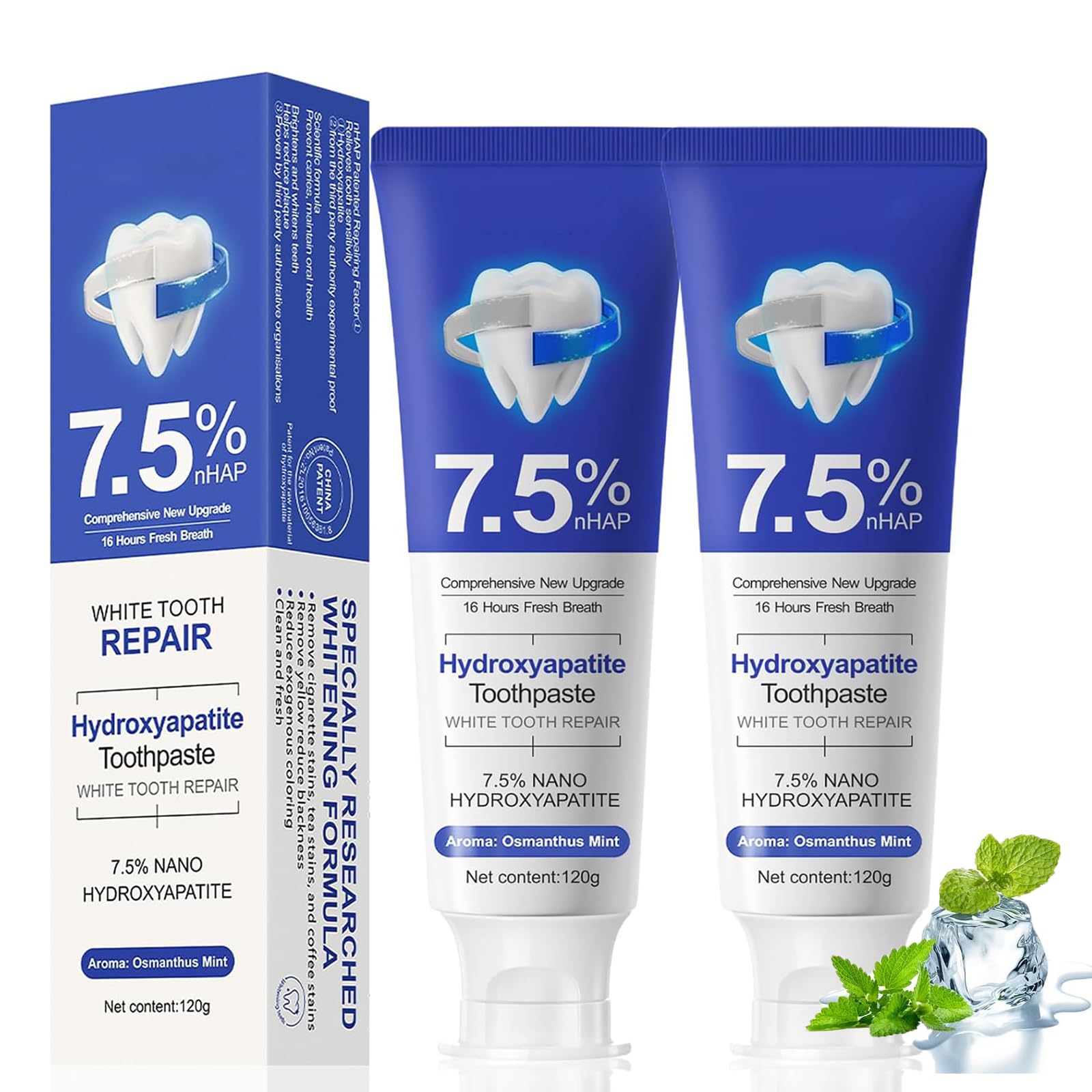 : 7.5 Hydroxyapatite Toothpaste, advanced enamel protection, hydroxyapatite toothpaste, for sensitive teeth, oral health management, Add the menthol factor, fresh breath Specification: Name:Hydroxyapatite toothpaste Shelf life: 3 years Net content: 120g 4.1 ounces Efficacy: Refreshing breath,keep the mouth moist, fresh and fragrant. Packing includes: 1 2 3 hydroxyapatite toothpaste