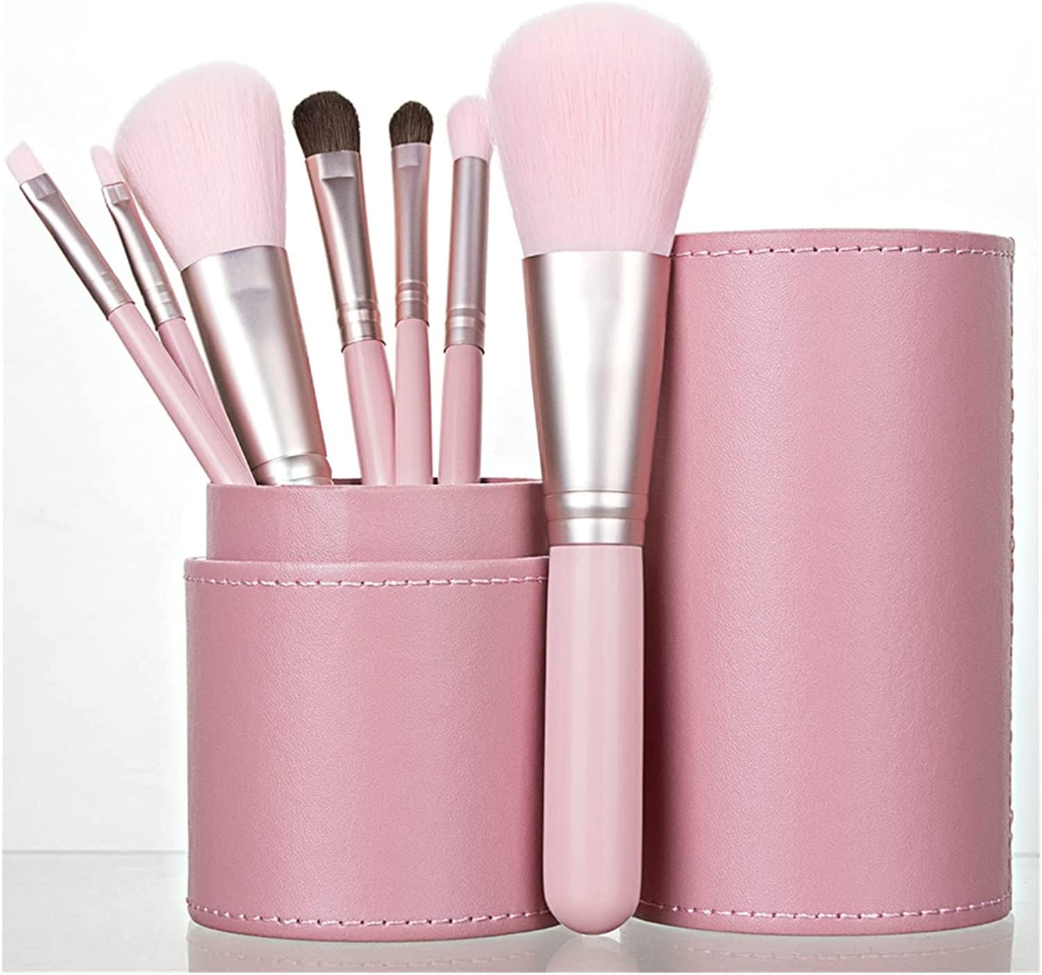 Introducing the Makeup Tool Brush 7pcs with a Cylinder Brushes holder, a must-have set for achieving flawless and professional makeup looks. This comprehensive set includes seven high-quality brushes made with premium synthetic hair, ensuring a luxurious feel and optimal performance. Use as a highlighter brush. Experience the excellence of these brands in your own makeup routine and enjoy the flawless application of your favorite products. The convenient cylinder holder not only keeps your brushes organized but also adds a touch of elegance to your vanity or makeup area. Say goodbye to cluttered countertops and hello to a neat and stylish brush storage solution. These brushes have quickly become travel favorites among beauty enthusiasts. The compact size and lightweight design make them perfect for on-the-go touch-ups or for packing in your travel essentials bag. Whether you're traveling for business or pleasure, these brushes are your trusted companions for maintaining your flawless makeup look. With a variety of brushes for foundation, blush, blending, contouring, highlighting, and concealing, this set offers versatility and allows you to explore different makeup techniques and styles. From a natural everyday look to a glamorous evening transformation, these brushes will help you achieve stunning results. Not only are these brushes suitable for professionals, but they are also perfect for makeup enthusiasts of all skill levels. Whether you're a beginner or an experienced artist, these brushes provide the tools you need to enhance your makeup skills and create beautiful looks. This Makeup Tool Brush 7pcs with Cylinder Brushes holder has quickly become one of the selling items in the beauty industry, and it's no wonder why.