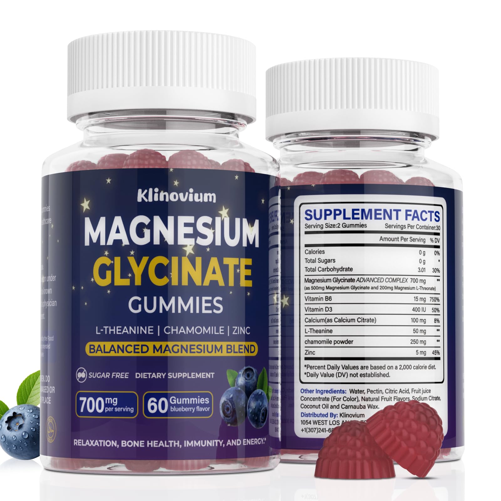 Made in the USA - Just 2 gummies per day can provide 1 month's energy supply at any time. Crafted with premium, science-backed ingredients and third-party tested to ensure purity, safety, and quality. These gummies are gluten-free, soy-free, wheat-free, and yeast-free, making them 100 vegan and non-GMO. Please feel free to contact us with any questions. Delicious Blueberry Gummies - No Pills, No Powder: Say goodbye to hard-to-swallow capsules and bitter powders. These delicious blueberry-flavored gummies are a fun and easy way to get your daily dose of magnesium. Naturally flavored and made with pectin (not gelatin), it's perfect for adults and teens looking for a great-tasting supplement. Powerful Calming Relaxing Effect-- L-Theanine, naturally found in green tea, promotes relaxation by supporting alpha brainwave activity. Vitamin B6 may support magnesium absorption and help reduce potential stomach discomfort. These vitamins work synergistically with magnesium glycinate, help promote melatonin production in the brain, thus promoting rest. 10x Higher Absorption--Magnesium glycinate is known for its excellent bioavailability and being gentle on the stomach. In the glycinate form, it is easily absorbed and recognized by the body. The chelated form, bound to two glycine molecules, absorbed more magnesium into the body, compared to other forms of magnesium. It also helps support gut health by promoting the integrity of the intestinal barrier. Potent Magnesium Complex Gummies-- Magnesium Glycinate helps regulate neurotransmitters like GABA in the brain, facilitates the binding of GABA to its receptors, thus promotes relaxation and clm, it also involved in the conversion of melatonin and the regulation of muscle contractions. Helps relax muscles and maintain brain, mood, and sleep health, while also enhancing energy levels.