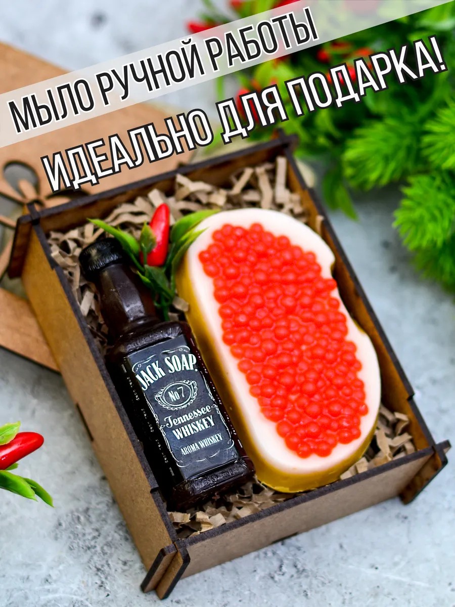 В набор входит: Мыльная бутылка, мыльный бутерброд, всё в подарочной упаковке (деревянный бокс).