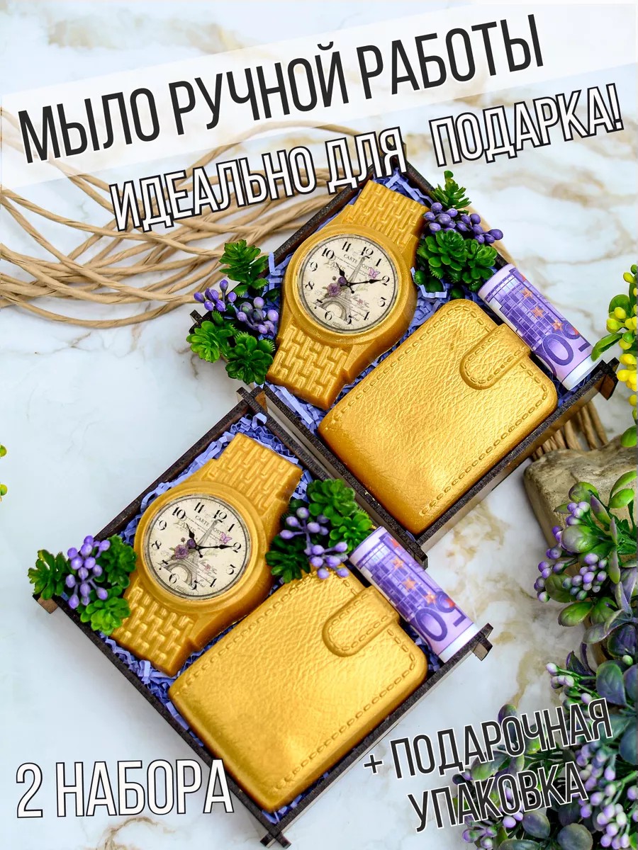 Общий вес мыла в одном примерно 165 грамм. В набор входит: мыло - часы (65 гр) и портмоне (100 гр), муляж купюры, бумажный наполнитель и декоративная флористика. Подарочный деревянный бокс собственного производства - 11 см х 13 см. Мыло имеет приятный фруктовый аромат, который поможет расслабиться и насладиться процессом ухода за кожей. Наше мыло идеально подойдет для мыльницы в вашей ванной комнате, потому что имеет небольшой размер и ровное основание.