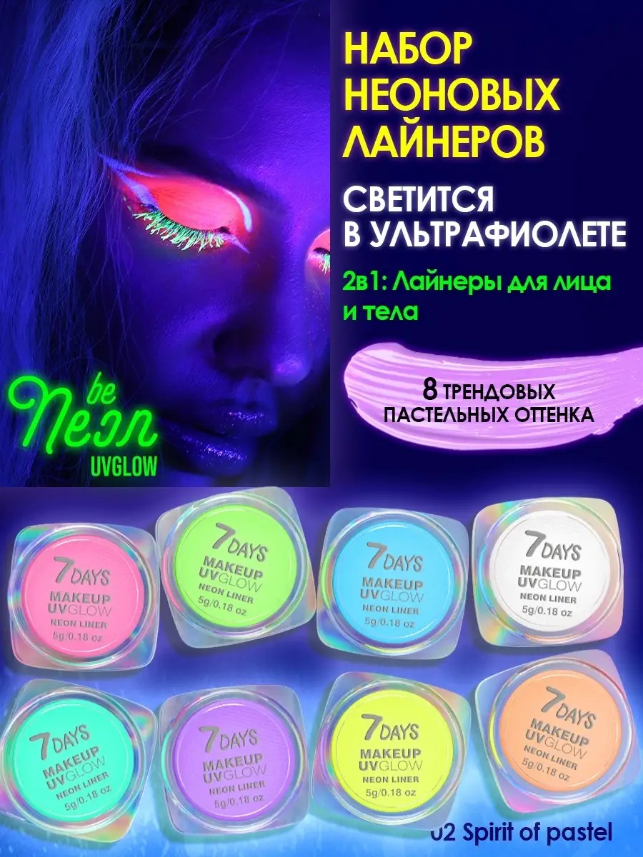 Аквагрим для лица и тела профессиональный 7DAYS MyBasic UV GLOW NEON. Набор 8 оттенков. Светятся в ультрафиолете. Средство для макияжа и творчества на вашем лице и теле. Можешь смешивать аквалайнеры и создавать уникальные цветовые сочетания. Грим с высокой пигментацией легко наносится, моментально высыхает и стойко держится и светится UV. Аквагрим для лица абсолютно безопасен для кожи и не вызывает раздражения. Грим для хобби и творчества водостойкий с насыщенными глубокими оттенками ложится ровно плотным слоем, не растекается и не трескается.