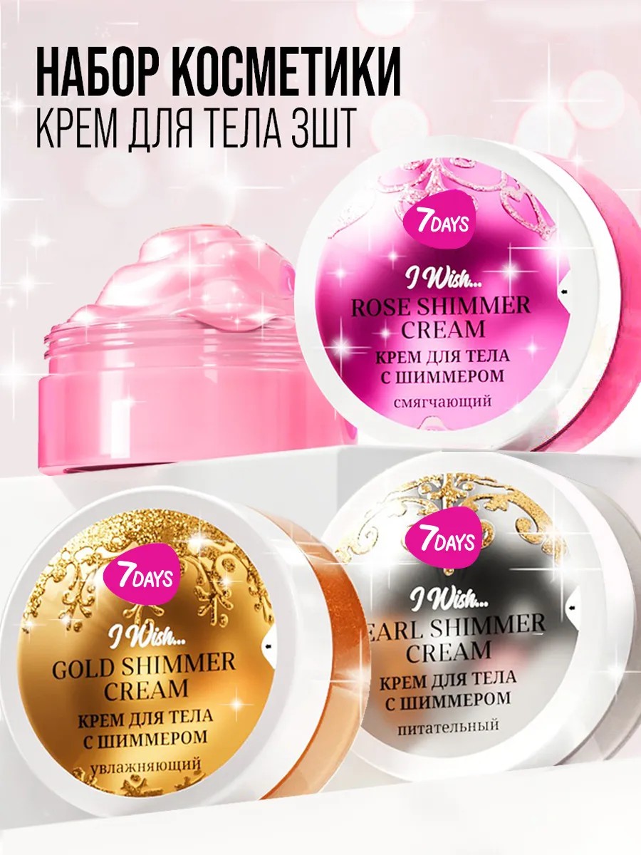 Крем для тела 7DAYS с шиммером, набор 3 штуки по 60 мл. Увлажняющий крем для тела моментально устраняет сухость и шелушения. Плотная питательная текстура с комплексом масел делает кожу упругой и мягкой. Суперувлажняющий крем для тела с парфюмированными ароматами.