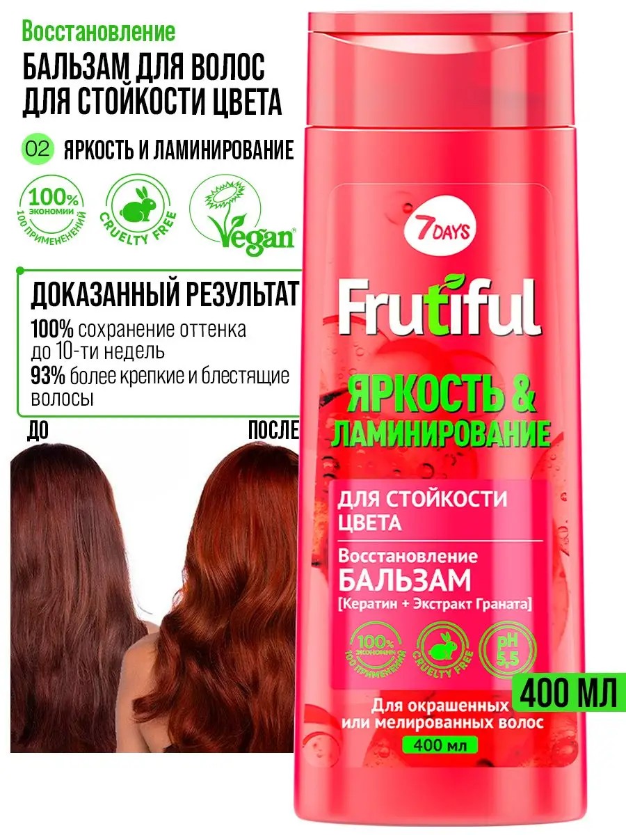 Средства для волос Frutiful придают твоим волосам блеск, сияние и красоту, питают и восстанавливает их без утяжеления, а благодаря эффекту профессионального ламинирования, роскошный цвет сохраняется до 10 недель! Бальзам подходит для всех типов волос, для ежедневного использования.