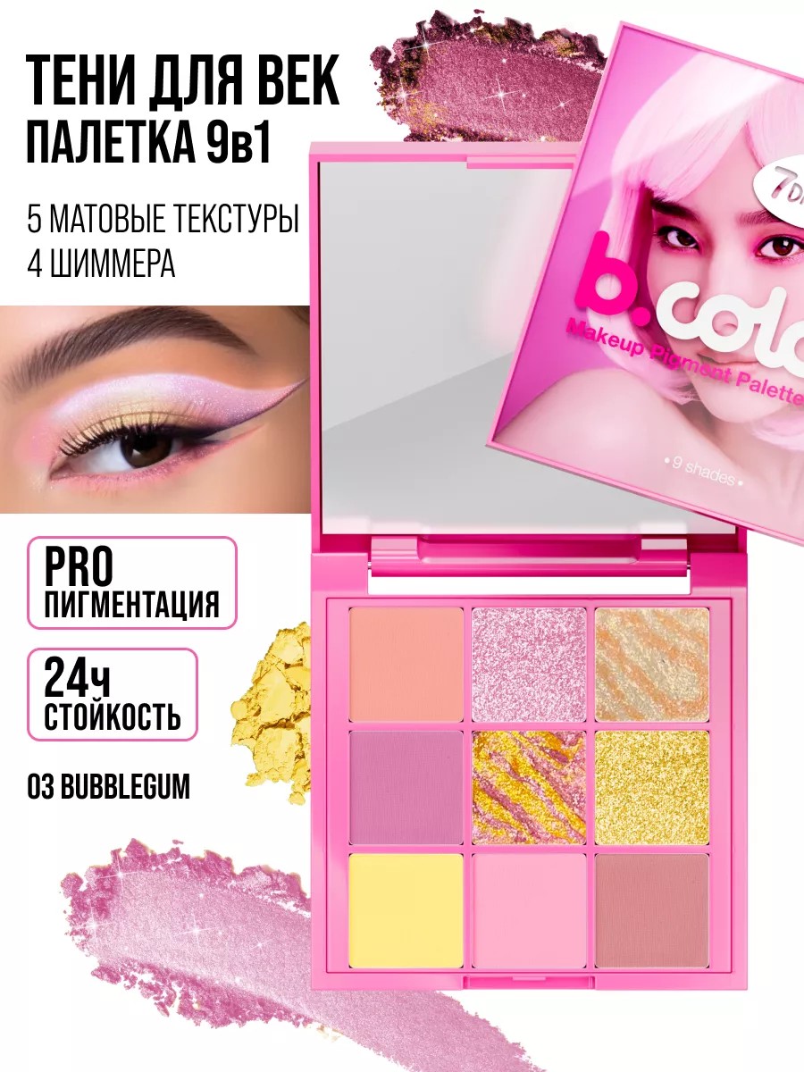 Тени для век 7DAYS B.COLOUR 03 BUBBLEGUM - это профессиональная палитра из 9 неповторимых оттенков и текстур. Палетка теней для век разработана визажистом и гармонично сочетает в себе тени для век с блестками и матовые, нюдовые и яркие оттенки. Высокопигментированные тени для век отлично тушуются и равномерно ложатся, без потери интенсивности цвета в течение дня и ночи.